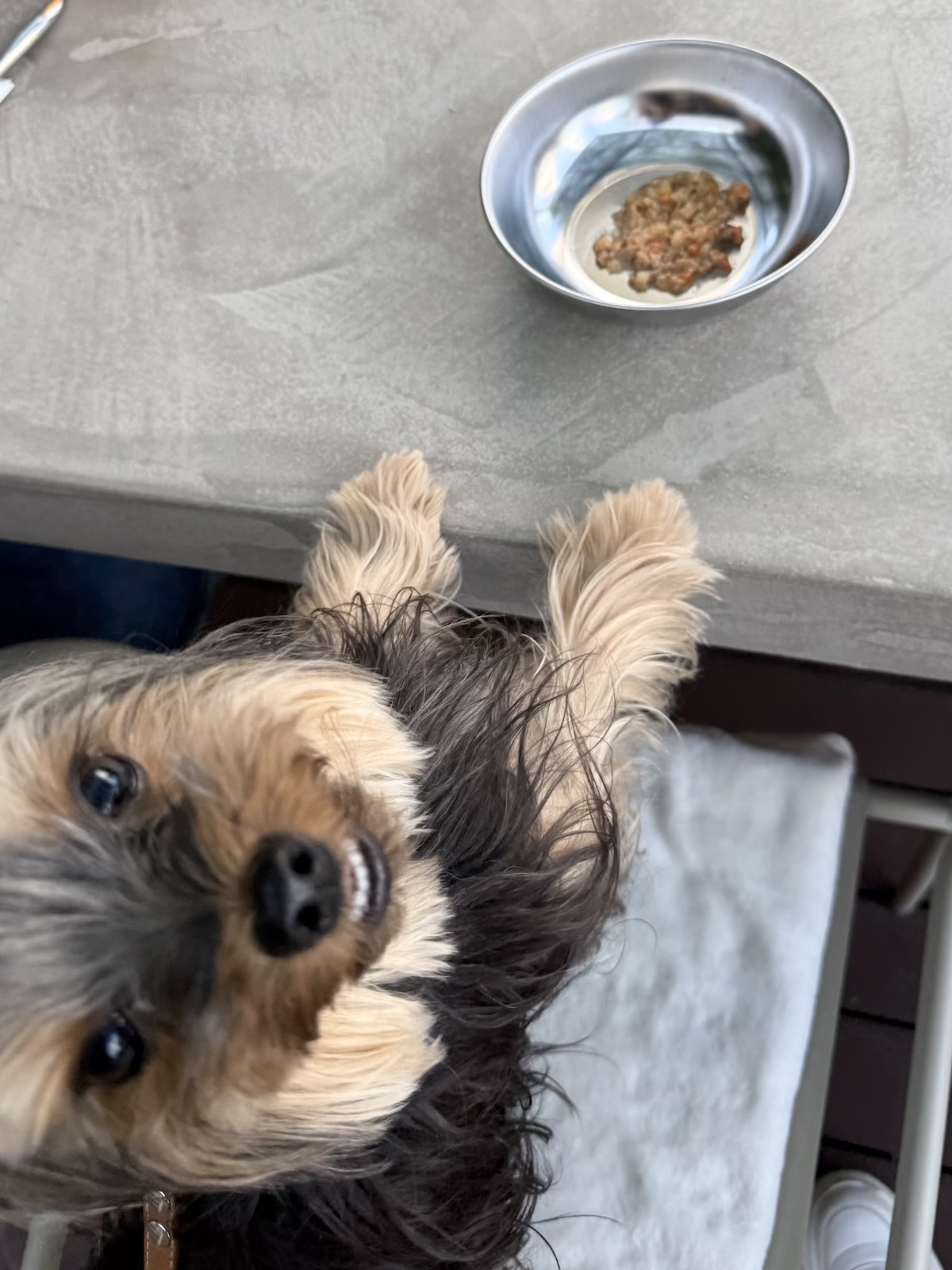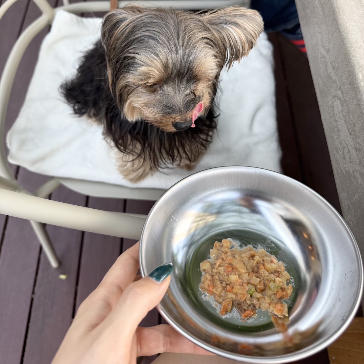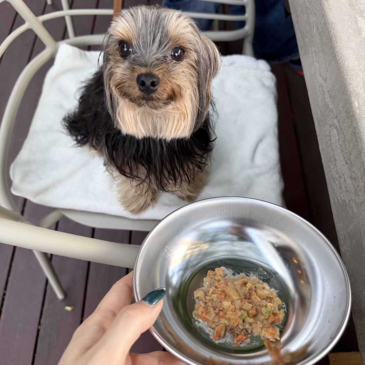 エルトンくんはというと、「馬肉とトマトのごはん」をオーダー。目の前に運ばれてきた瞬間から、目はらんらん、興味津々でお鼻はくんくん……(笑)。待ちきれない様子で、あっという間に完食!