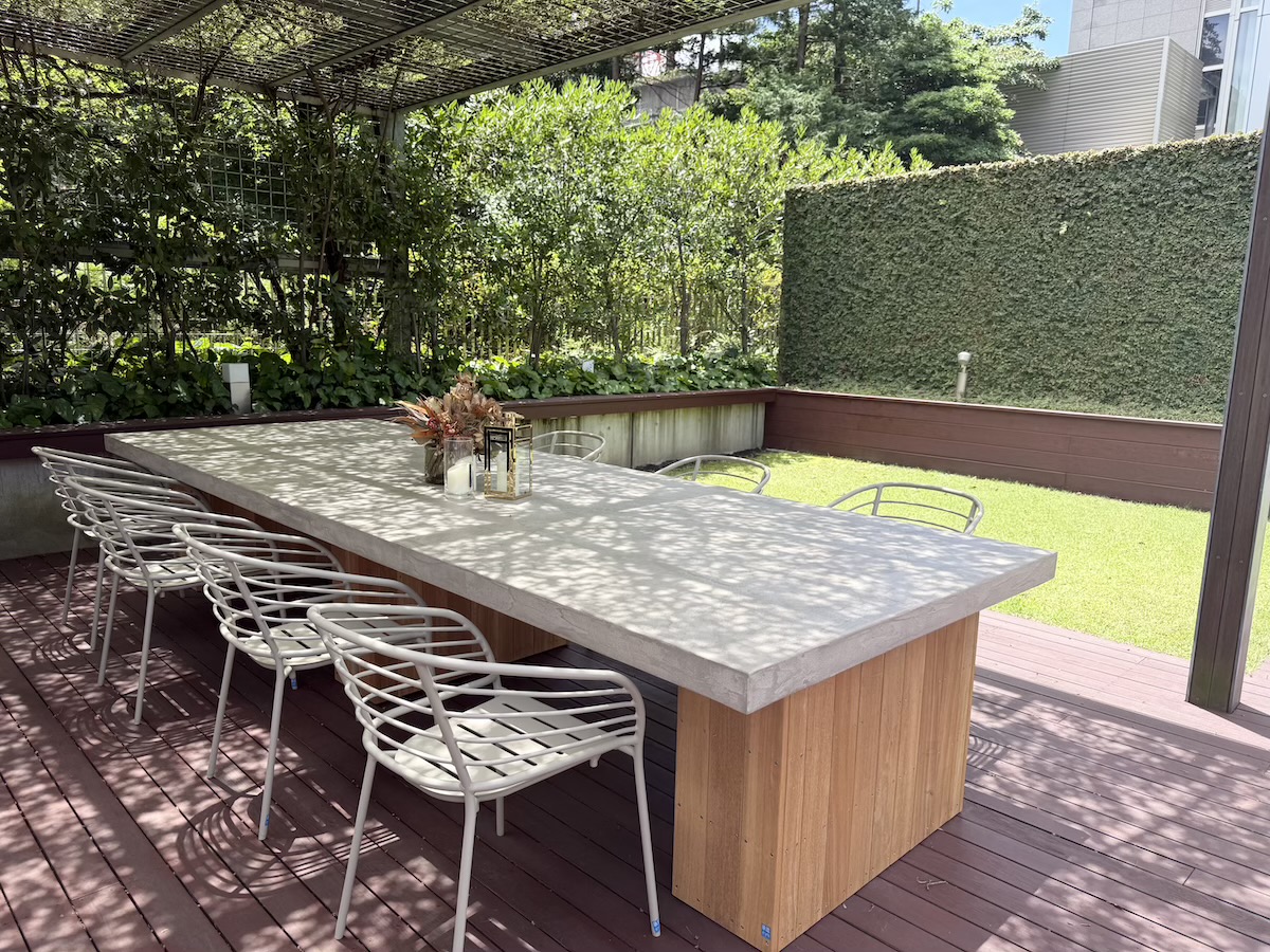 店内の外に広がるテラス席は、芝生とウッドデッキが美しく整えられ、頭上にはパーゴラ。その下に大きな長テーブルが。ここは、ビルの共有部分でありながら、店内から続いているような空間。30〜40名規模の貸切パーティも十分に行える店内から一歩外に出ると、なんと東京タワービューも! テイクアウトも充実しているので、この空間で木漏れ日を感じながら、愛犬と一緒に美味しいごはんを食べて過ごすこともできてしまう! これはもう、“犬会”を開催するしかありません(笑)。