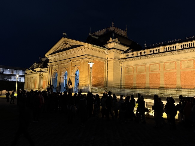 京都の街が夕闇に染まりはじめた頃向かったのは、この旅のクライマックスとなる、京都国立博物館・明治古都館。ライトアップされた赤レンガと白亜の装飾が夜空に浮かび上がり、思わず息を呑む美しさ! 建物の前には長蛇の列が伸び、この建築がいかに愛されているかを物語っています。