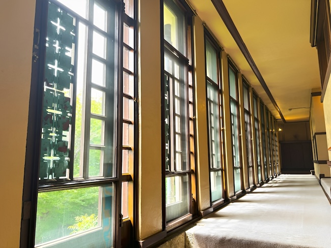 ライトは特に“影”を大切にした建築家でもありました。午後3時ごろになると、3階の廊下にある飾り銅板を通して差し込む光が、廊下の床に木漏れ日のような影を落とします。その光景もまるで自然の中にいるかのようで、思わず足を止めて見入ってしまうほど美しいものだそうです。(今回は午前中に訪問のため、光を見ることは叶わず。)
