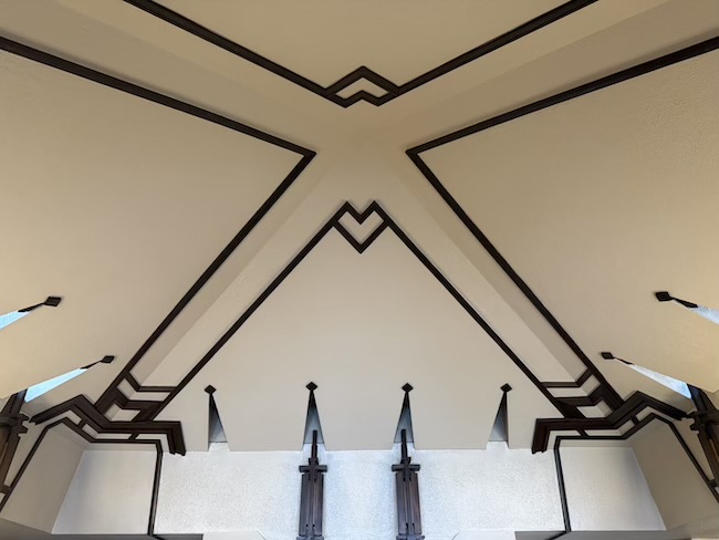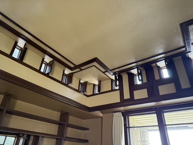とにかく細部の細部まで本当にこだわりが強く、ライトさますごい…!としか言葉が出ません。(それと同時に、いったい当時の建築費はいくらだったのだろう…と考えてしまいます。)窓や扉には植物の葉をモチーフにした薄い銅板の装飾が施され(0.3ミリほどの薄い銅板を4枚半田付けしたものだそう。)、年月とともに銅が緑青へと変化し、本物の葉のような質感を帯びていきます。入口は意外なほど低く設計されていますが、これは建物の内部空間をより広く感じさせるための演出なのだとか。