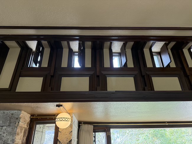 そして、室内なのに、外にいるような清々しい空気感を感じます。それは、ライト建築の大きな特徴のひとつ「小窓」のおかげ。建物全体でおよそ120もの小窓が設けられており、そこから光と風を取り込む設計になっているそう。照明も天井には設けず、あくまでも自然のままに過ごすことができる、贅沢な造りです。
