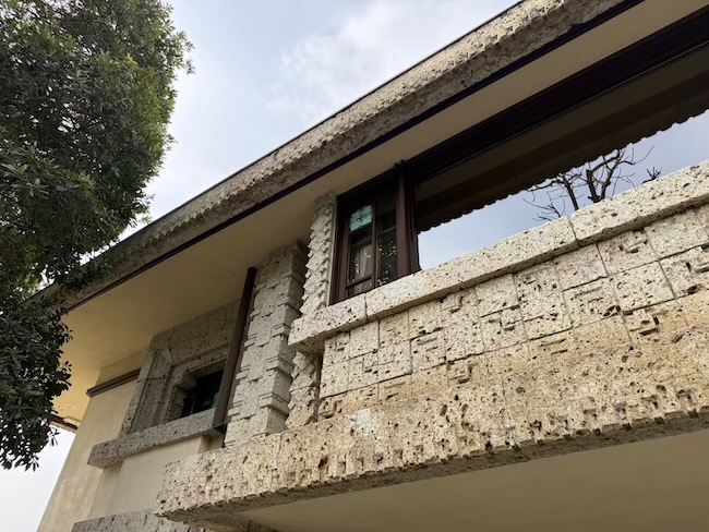 ライトが得意とする、水平に伸びる直線を強調した典型的なプレーリースタイルの建物です。外観でまず目を引くのは、独特の質感を持つ石材。柱や壁には栃木県宇都宮市で採掘された大谷石が使われているそう。火山灰から生まれた柔らかな石で、彫刻が施しやすいのが特徴なんだとか。実際に見ると、四角形を基調とした幾何学的な彫刻が建物の随所に施され、独特のリズムを生み出しています。