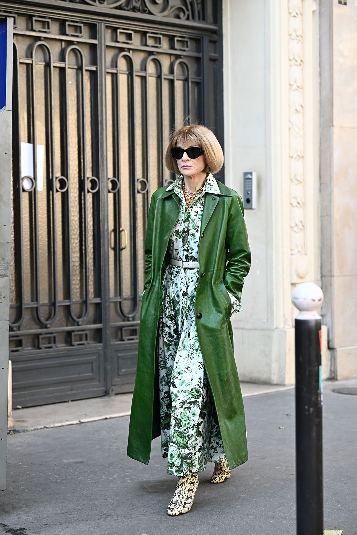 グリーンのレザーコートに、花柄のワンピースを合わせたアナ・ウィンター。ドレスに含まれるグリーンと同色のコートを選ぶことで、トレンドカラーを洗練された印象で着こなしている。