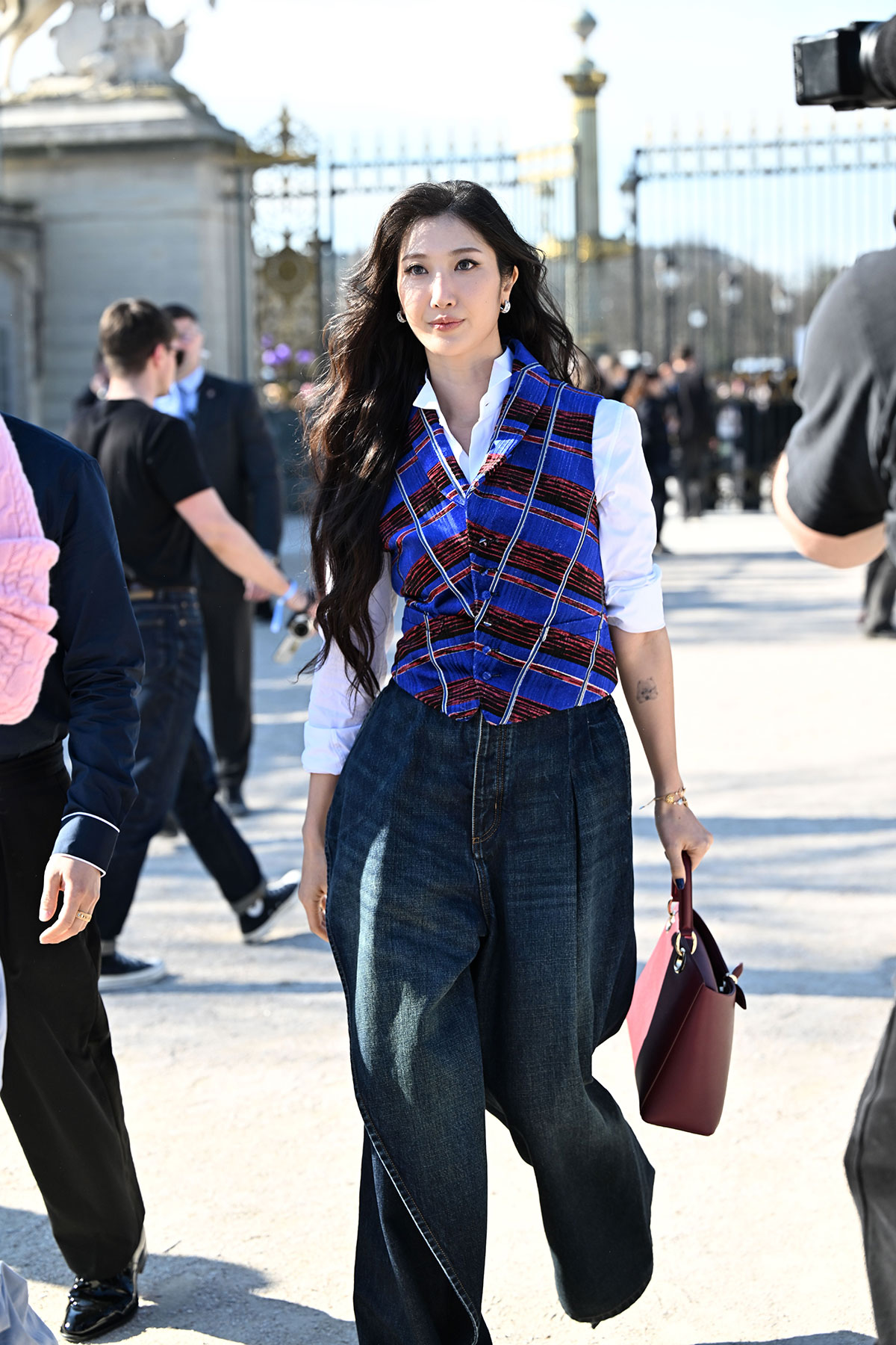 チェックのベストに白シャツ、ワイドデニムを合わせた、ディオール2026年春夏メンズ・コレクションからのルックをアレンジ。上半身はコンパクトにまとめつつ、ボトムでボリュームを出すことで、メリハリのあるシルエットに仕上げている。バッグはベストの色を拾ったピンクを選び、全体に統一感をもたせている。