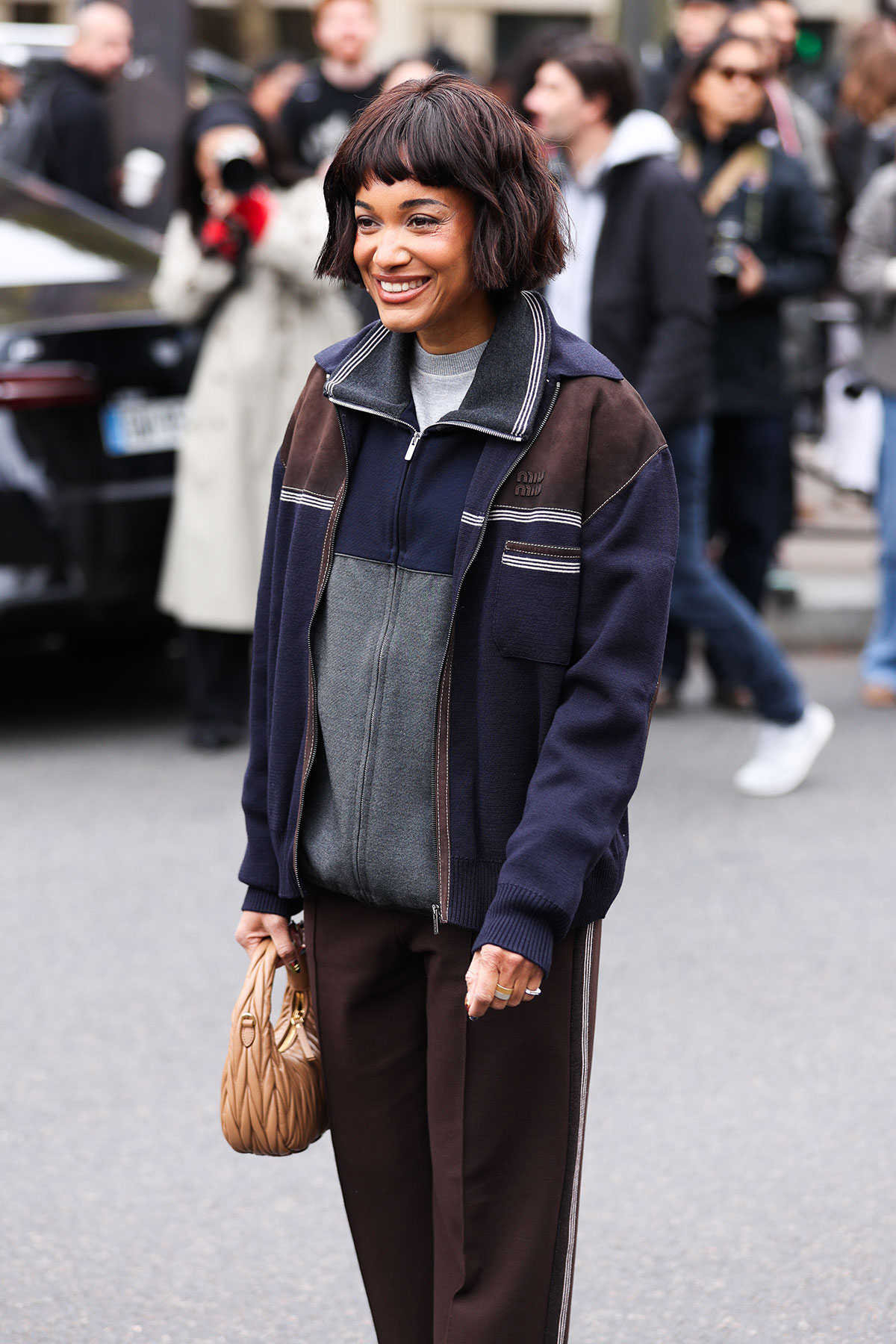スポーティなミックススタイルの火付け役となったミュウミュウ(Miu Miu)のジャージージャケットを主役に、全身でスポーティな気分を満喫。マテラッセレザーのバックを携えてフェミニンさもプラス。
