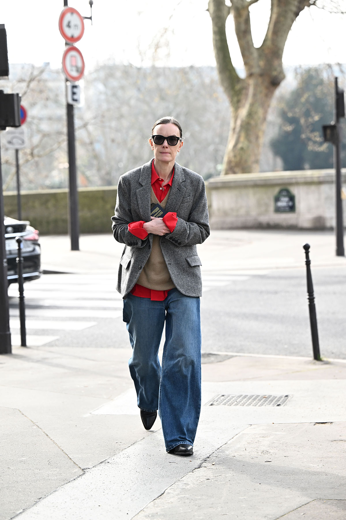 「赤のニットを肩にかけたり腰に巻いたりするスタイルは、セリーヌの新アーティスティック・ディレクターのマイケル・ライダーが提案してから、火がついたような気がします。ニットは着るだけでなく、巻いたり掛けたりすることでスタイリングをつくるアイテムとして使えるのがポイントです。