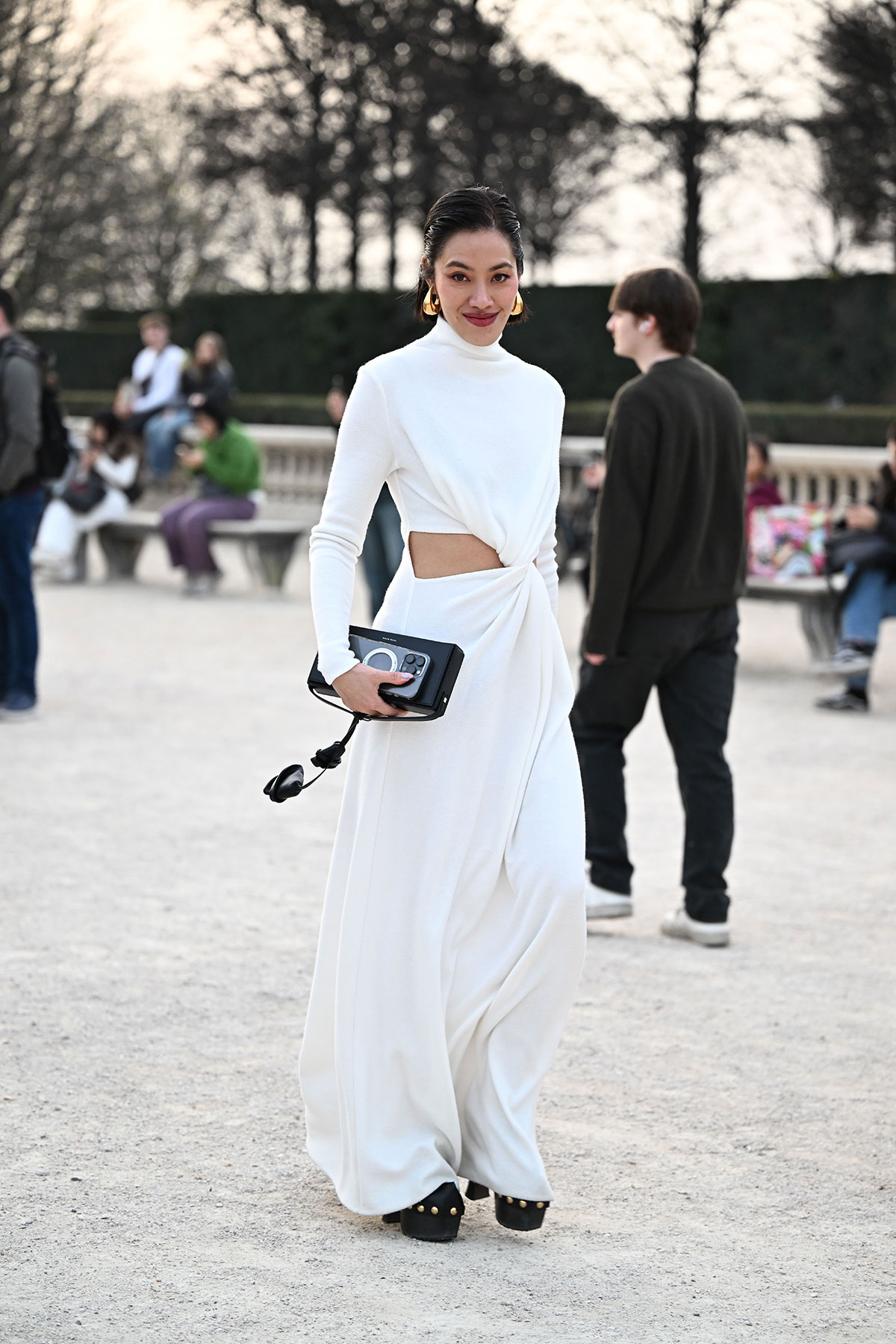 ドレープの効いたホワイトドレスに、ブラックのバッグとシューズを合わせたスタイリング。構築的なシルエットとウエストのカットアウトで一癖加えた、エレガントな中にも軽やかさを感じさせる装い。ゴールドのイヤリングで華やぎをプラス。