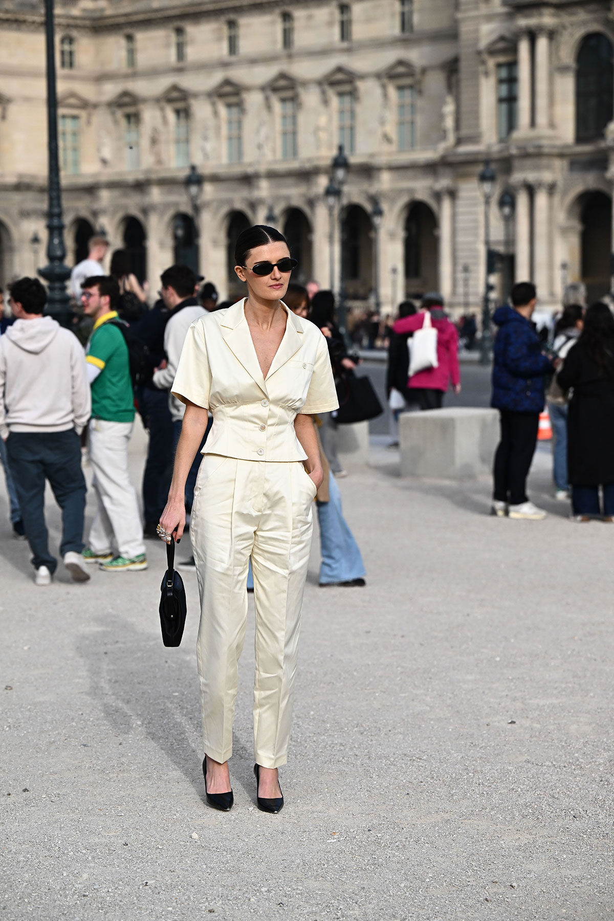 クリームカラーのショートスリーブジャケットとパンツのセットアップ。ミニマルなデザインながら、上下でそろえることで存在感のあるスタイリングに。ブラックの小物で全体を引き締め、洗練された印象に仕上げている。