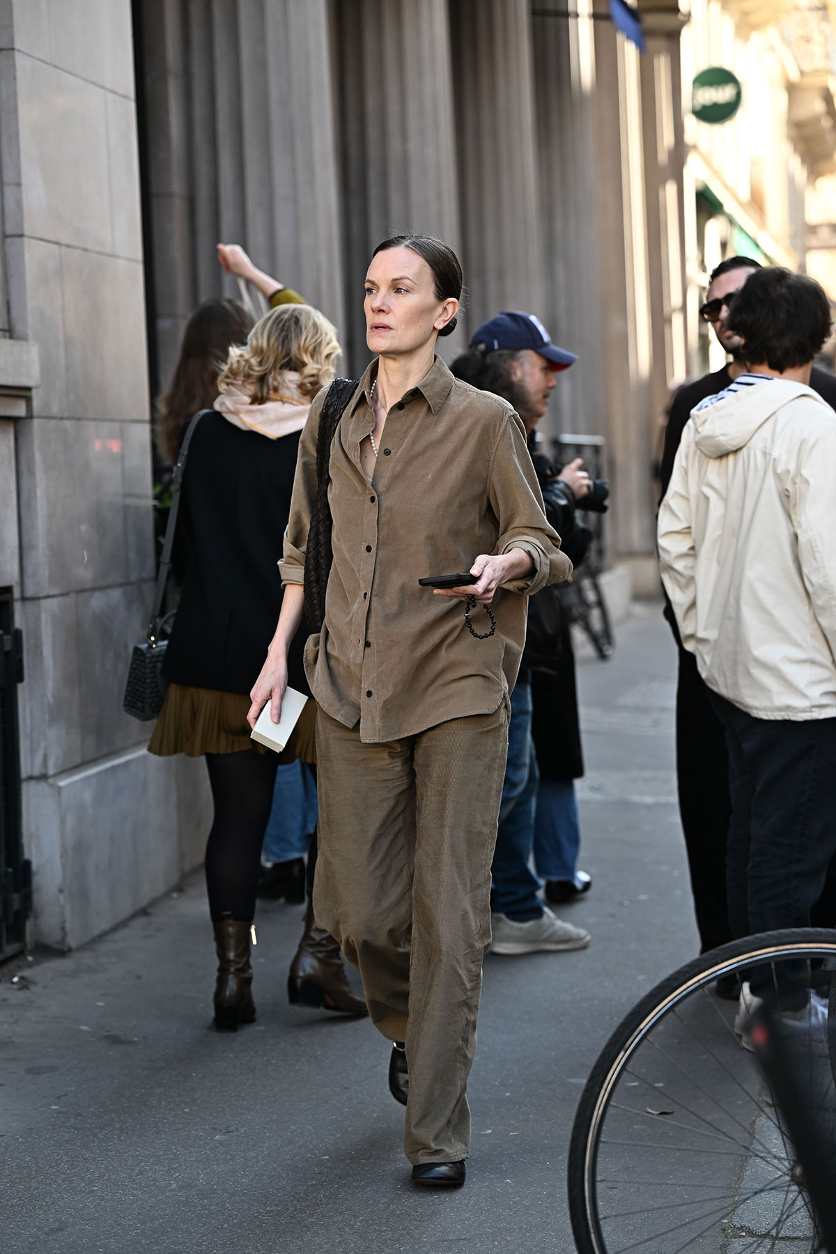 足元やバッグもあえて黒で締めすぎず、全体のトーンに寄せているのが印象的。強くコントラストをつけないことで、自然になじみながら洗練された雰囲気に仕上がっています」