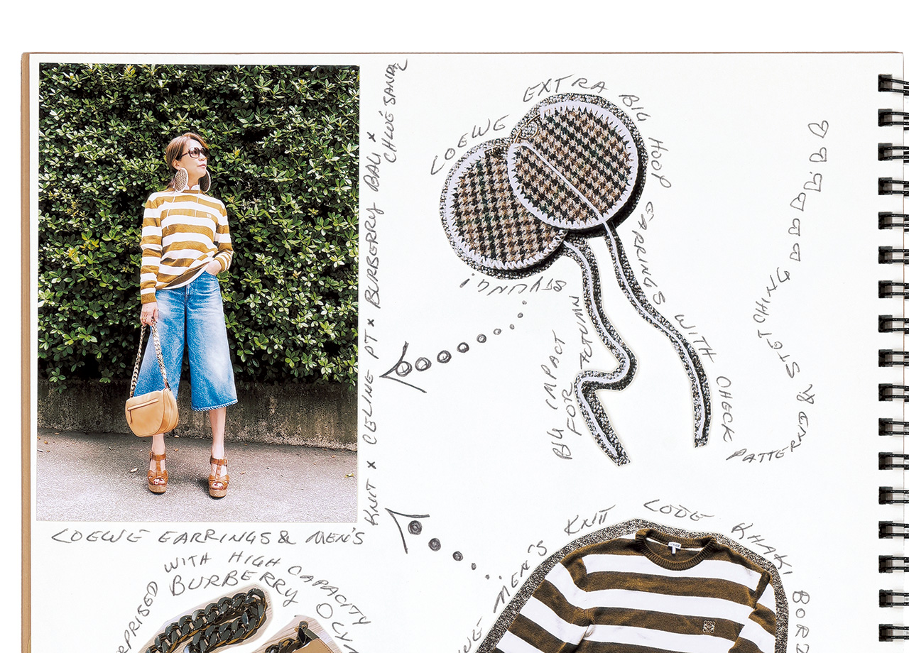 この日は、ロエベ(Loewe)のニットを主役にコーディネート。ニットからカスバ(Casba)のシャツの襟をチラ見せしているのがポイント! セリーヌ(Celine)のデニムパンツ、ロエベ(Loewe)のピアス、クロエ(Chloé)のサンダルを合わせて、デニムとブラウン系をまとめてみました。