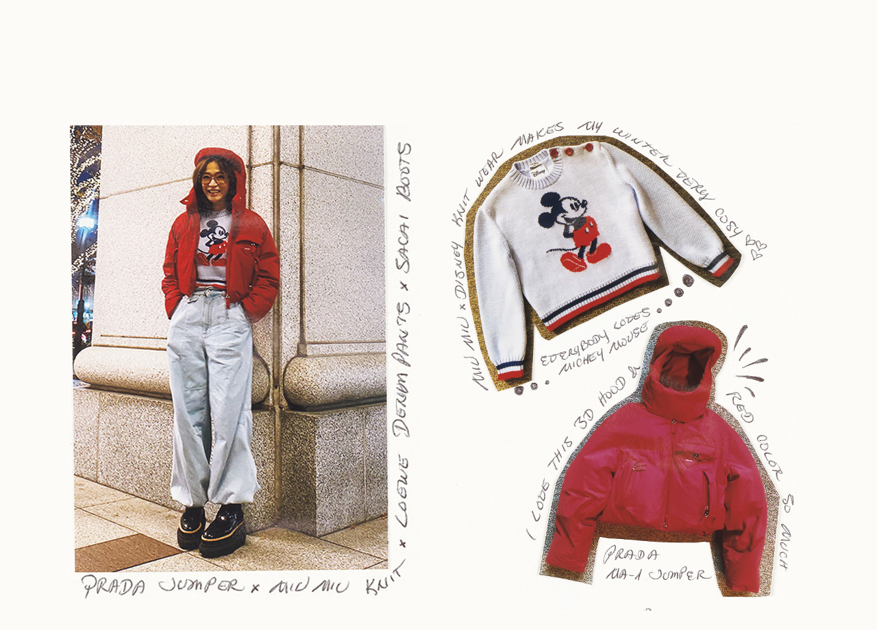 ミュウミュウ(Miu Miu)のニット。クロップド丈とポップなミッキーモチーフが、Y2Kっぽい要素で最近の気分に合っています。間違いなく、この冬ヘビロテしたアイテムの一つ。