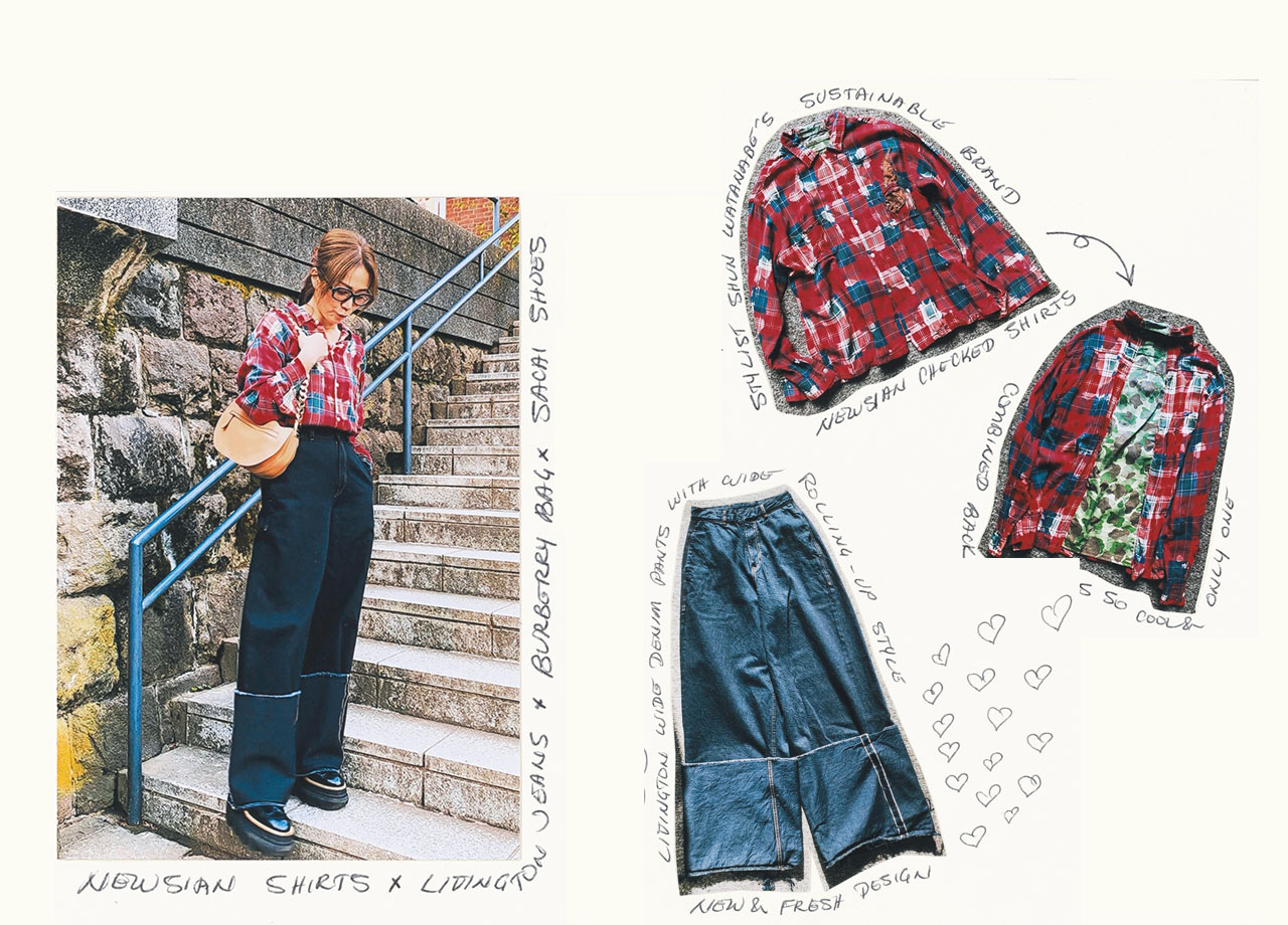 スタイリストのシュン ワタナベのライフスタイルブランド、ニュージアン(NEWSIAN)のシャツ。小さくなったチェック柄のシャツのバックをカットして、カモフラージュ柄のトップスを組み合わせているのが好き。シュンさん自身が染めたり縫ったりとハンドメイドしている愛情たっぷりの1点もので、買ったときの想像以上に私も愛着を持って着ています。