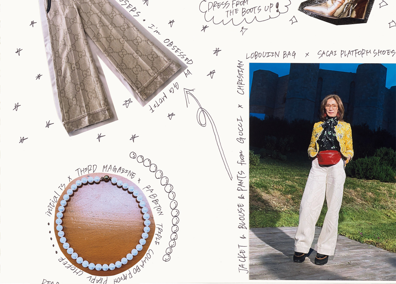 スタイリングでも着用しているグッチ(Gucci)のパンツは、プーリアへ向かうトランジット中に購入したアイテム。カジュアルな素材感もGGパターンがモードに仕上げてくれるので、気負いすぎない今のマインドに合っています。