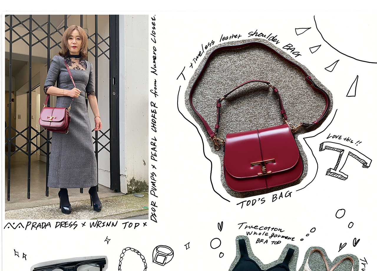 Tロゴのメタルバックルがエレガントなトッズ(TODʼS)のバッグ。量もたくさん入るし、ストラップを付け替えてハンドバッグとショルダーバッグのどちらでも使えるのでスタイリングによって変えています。