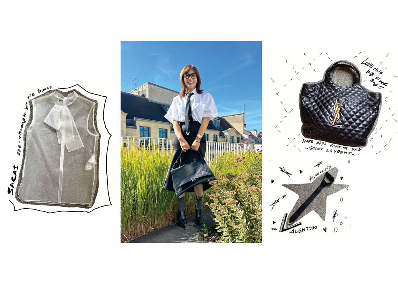 以前、紹介したゴールデングースのセットアップに、サカイのブラウスとシャネルのミニバッグを合わせて華やかなスタイリングに。足元には、パリのファッションウィーク中にヘビーユーズしたサカイのブーツを合わせてシックにまとめました。