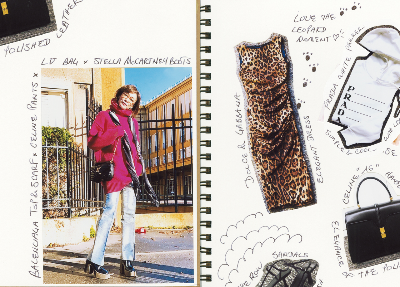136号でもご紹介したバレンシアガ(Balenciaga)のスカーフ付きニットに、かなり前にゲットしたセリーヌ(Celine)のシャイニーなデニムと、ポップなディスコ気分のルイ・ヴィトン(Louis Vuitton)のミニショルダーバッグを合わせて。綺麗なヴィヴィッドカラーとシャイニーなものを合わせたいという、今季の気分を体現しました。