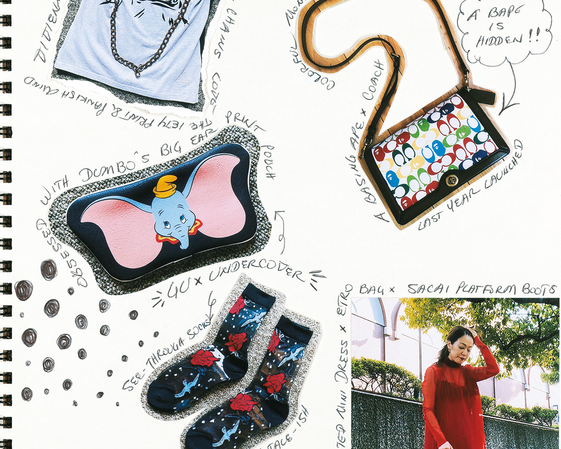 話題になったジーユー(GU) × アンダーカバー(Undercover)で見つけました。人気の転写ポーチに、キュートなダンボがお目見え! ダンボが耳を広げた正面カットは珍しいので、思わずゲットしました。こちらもジーユー × アンダーカバーのシースルーソックス。赤いバラと青い鳥の刺繍入りで、アンダーカバーらしい毒っ気あるメルヘンテイストがお気に入り。