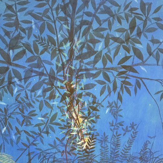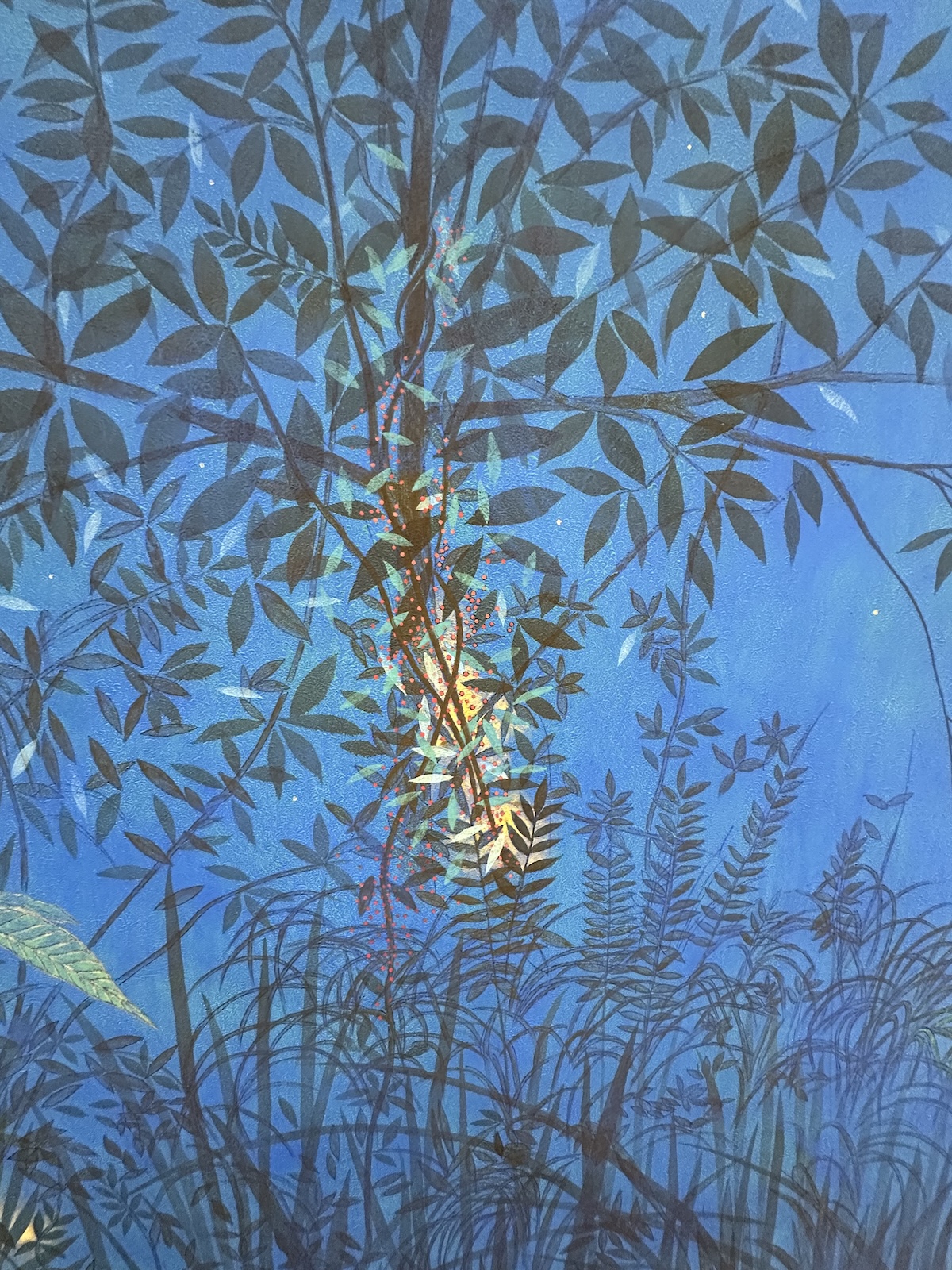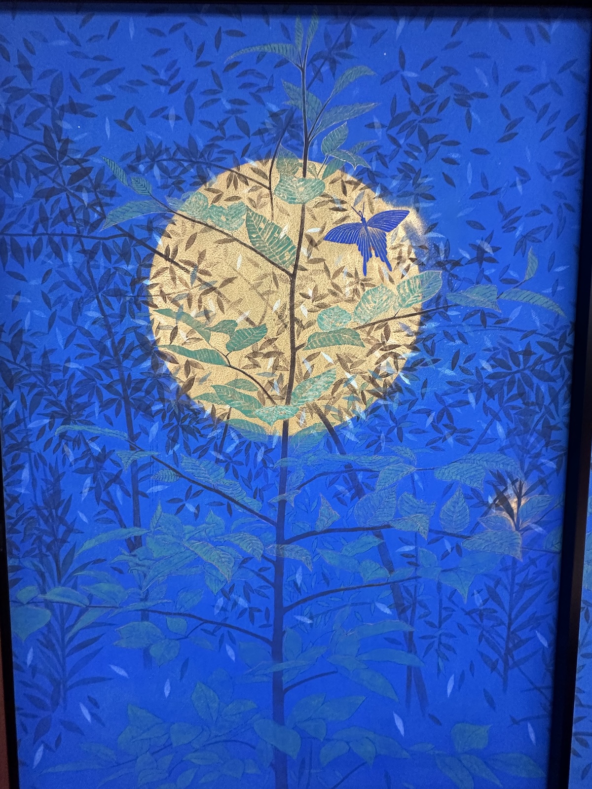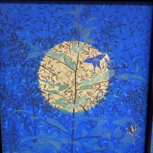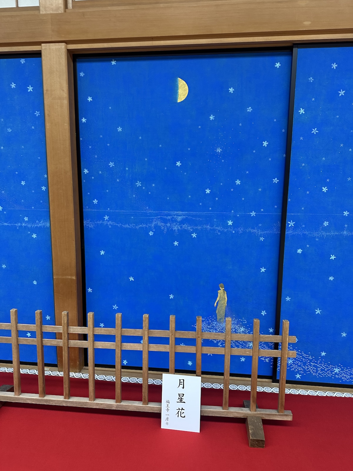 福王寺一彦氏の作品は、目の醒めるような青い色彩が印象的。天然の石を砕いた岩絵の具や24金、プラチナなどを顔料に混ぜた特殊な技法を用いて制作されていて、息を呑みます。ここには曼荼羅や、千住博氏の障屏画なども奉納されているので、高野山に行かれる際には、ぜひ足を伸ばしてみてください。