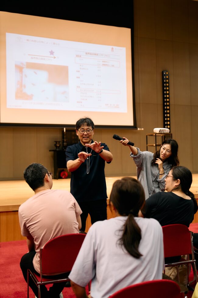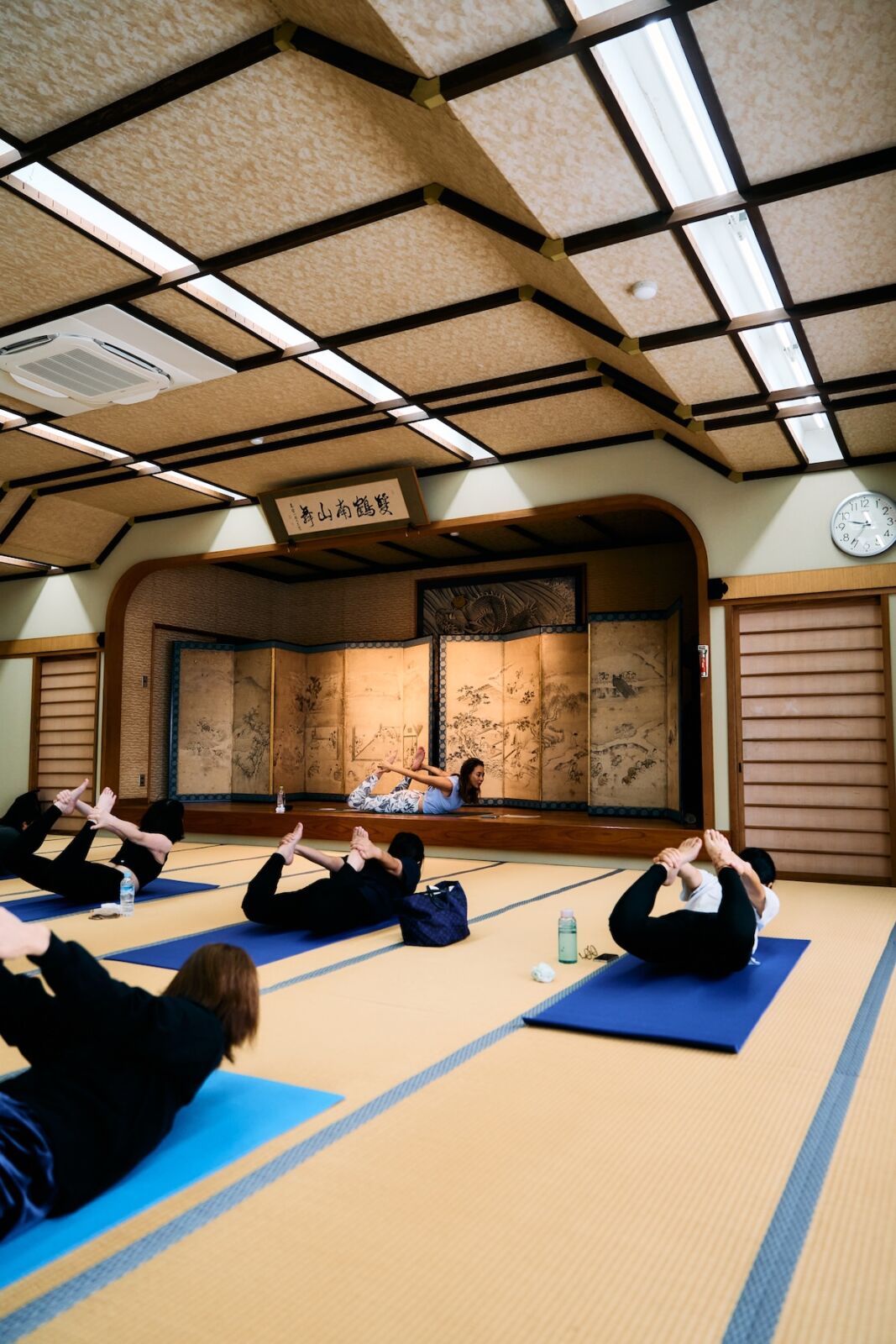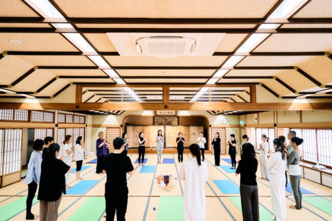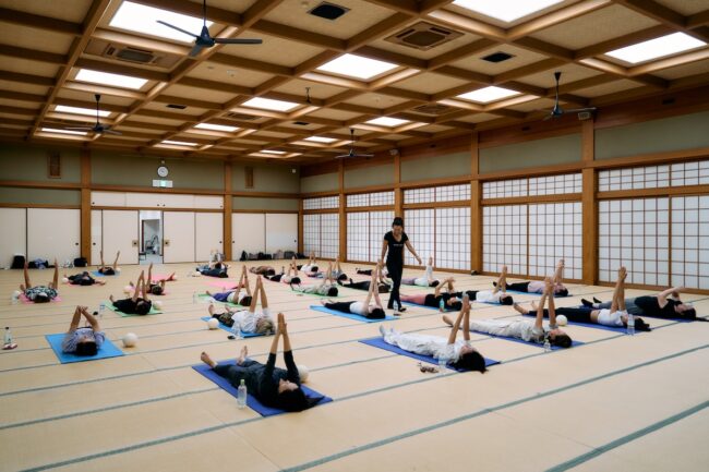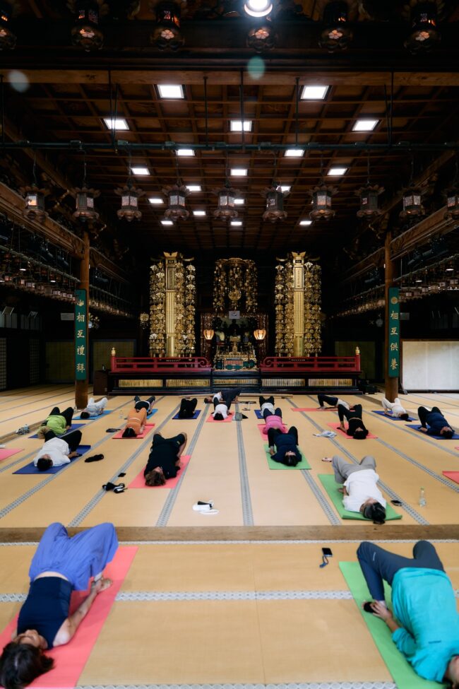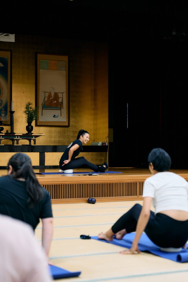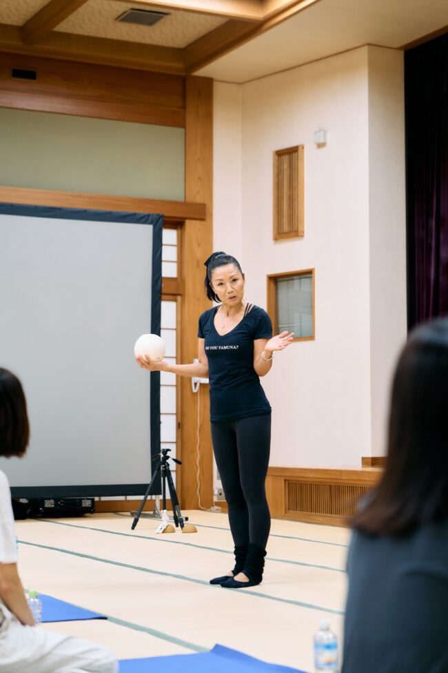 さて、金剛峯寺を堪能した私たちは、集合場所の大師教会・中講堂にてNY発 ヤムナ・ゼイク直伝のミカ(MIKA)講師によるヤムナ体験。ヤムナボールを使って骨にアプローチ。