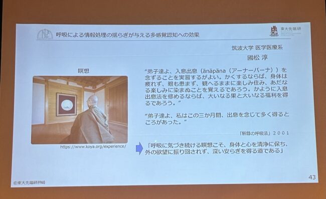 ここで学んだことを私なりに要約しますと・・・人は人間を中心とした視座で生きているが、自然中心の視座に転回すべきであり、「生かされている」ということを知るべき。身体、とりわけ内臓は自分自身ではコントロールできないものだけど、唯一、自身で意識して変えられるのが「呼吸」。そして瞑想の中心は呼吸への気づき。それをコントロールすることで、身体と心を清浄に保ち、欲望に振り回されず深いやすらぎを得る道に通ずるなど、説法にも似た東大の先端科学技術の教授のお話でした。