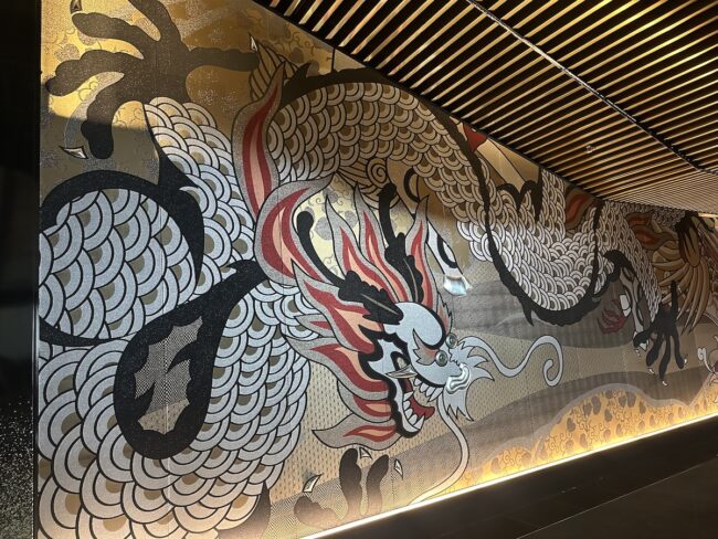そこからパブリックスペースへ進むと、高さ6メートル、幅19メートルという圧倒的な大きさの壁面「麟鳳亀龍図」(作:斉藤上太郎)の龍と目が合いました。壁画自体は京都の西陣織だそうで、お目でたい吉祥をもたらす四聖獣(麒麟、鳳凰、亀、龍)の姿が織り込まれています。
