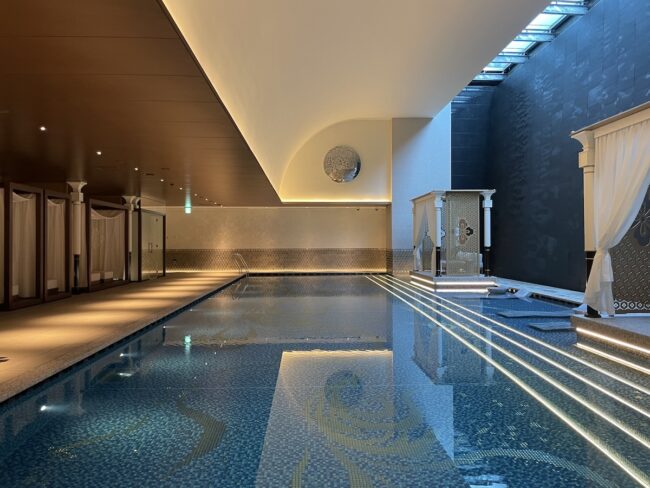 15時のチェックインから夕食まで時間があったので、ホテル散策のあと、プールとフィットネスジムで軽く汗を流しました。運動後は男女別になった天然温泉の温浴施設でひとやすみ。疲れた筋肉を解きほぐせます。