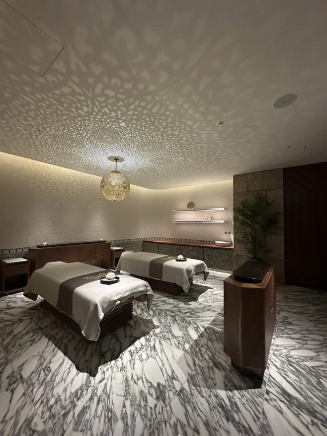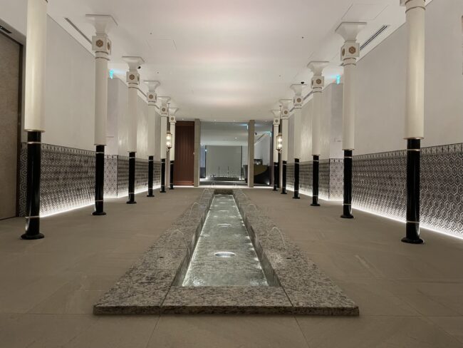 スパ・フィットネスエリアのエントランス。両サイドにタイルと列柱が並び、異国情緒漂う雰囲気。