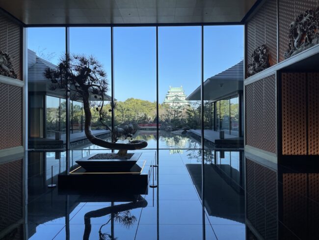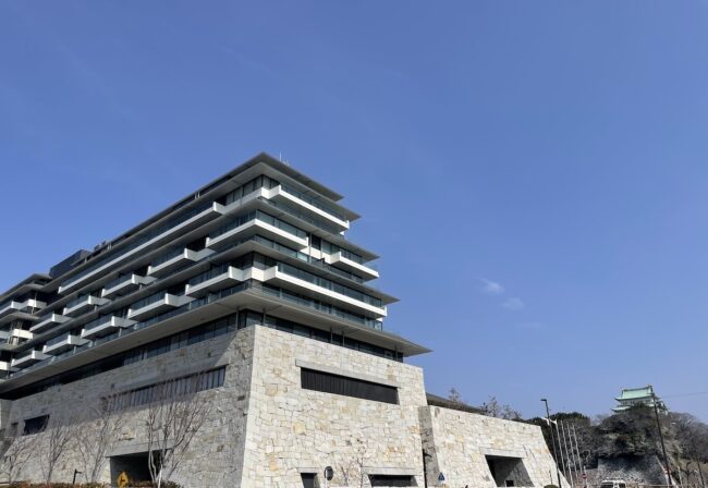 ロケーションは名古屋城の目の前。かつてその場所には、旧ホテル ナゴヤ キャッスルが建っていましたが、そこを更地にし、新しいコンセプトに基づいて新築でつくったそうです。ホテル外観は、名古屋城さの真横だけに、景観を損ねないよう(むしろ増長しているような?)大小の石がびっしりと積み上げられた基礎部分が印象的です。