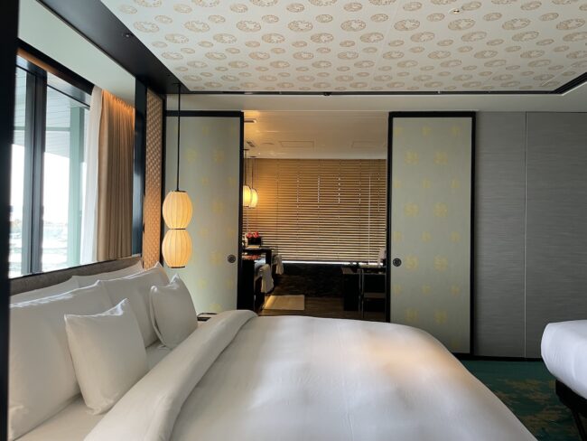 ベッドルームとその奥にバスルーム。ふかふかのスリッパなど、アメニティも充実していて、お部屋での滞在も大満足でした。