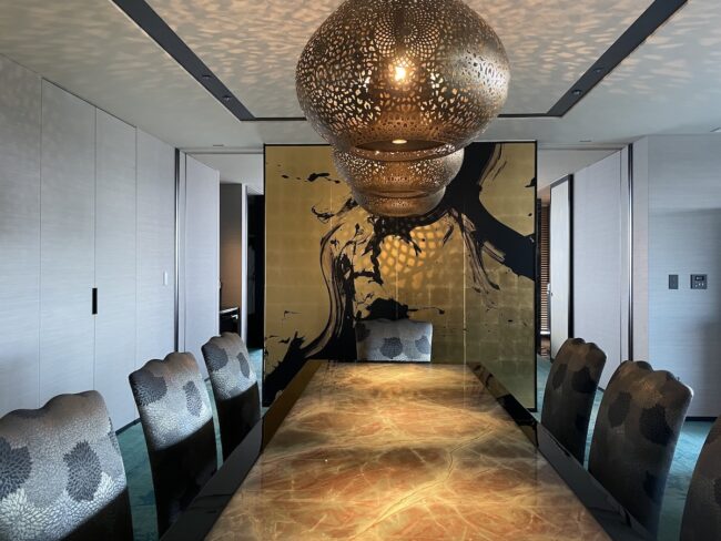 部屋によって飾られている作品が違うのですが、私の泊まった部屋のリビングには、金箔に「書」のような、抽象的かつ大胆なビジュアルが描かれた作品「LINEGRAPHY−臨」(作:宮村弦)が飾られていました。