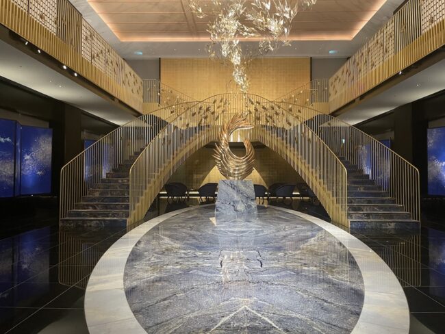 いざ、宿泊者専用フロアへ。心地よいアロマを香りに誘われながら廊下を奥へ奥へとと進むと、優美な彫刻と大理石に彩られた「鳳凰階段」が現れます。天井からはSTUDIO SAWADA DESIGNによる鳳凰の羽が舞い上がる作品、台座には鞍掛純一の彫刻が。すべてこのホテルのために創作された作品たちです。