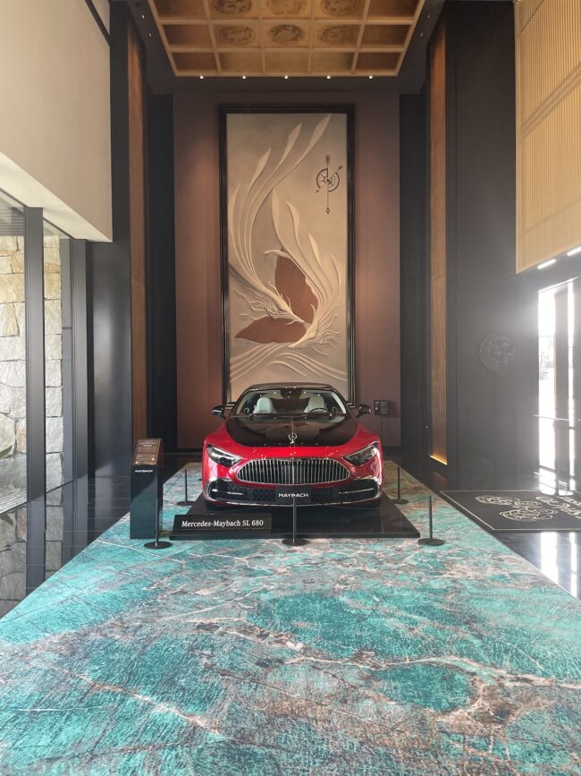 1階の宴会エントランスでは、左官職人、挾土秀平の「白龍」がリッチな MAYBACHの背後に鎮座しています。2匹の白い龍と、その間に蝶が舞うという幻想的な作品です。ちなみにご宿泊ゲストはホテル所有のラグジュアリーカー(写真のものではなく、そちらは黒塗り)で駅や空港までの送迎サービスがあるそうです。