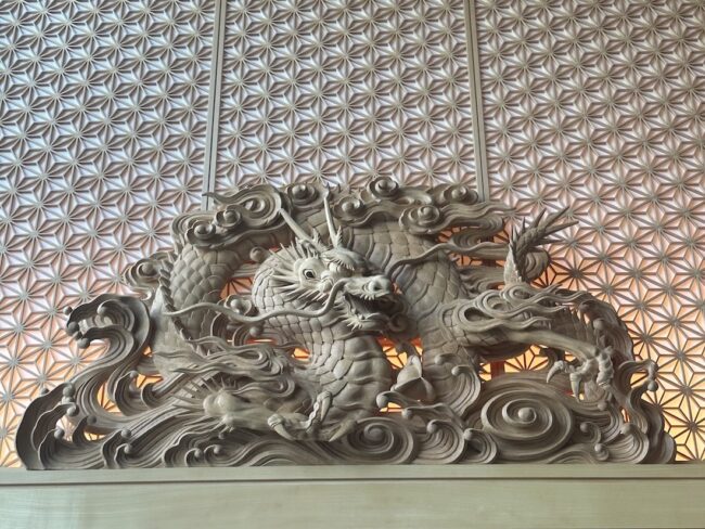 同じく4F宿泊ロビーの壁には、超絶技巧でつくられた彫刻が! これは富山県南砺市に伝わる国指定の伝統工芸品「井波彫刻」で、2018年にこの技法で、空襲で焼けた名古屋城本丸御殿の欄間7枚を復元したそうです。おめでたい松竹梅や龍、亀、鳳凰、麒麟などが表現され、その造形美に見入ってしまいます。