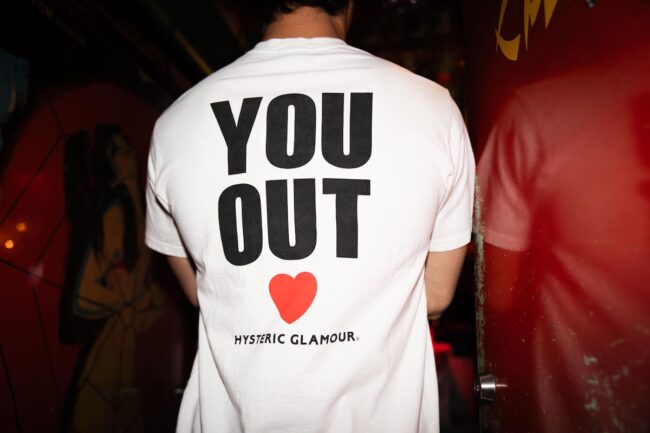 ヒステリックグラマーとのコラボTシャツは、マナーの悪い客を出入り禁止にする——そんな令子さんのスタンスを、古株メンバー・北村信彦氏がグラフィックで表現。会員制バーという特性上、顧客の安全性を最優先に考えたカスバのシステム(というより、令子さんの美学とも言えるルール)からは、ピリッとした厳しさの中に、しっかりとした愛とユーモアが感じられます。思わず頷いてしまうような、秀逸なメッセージが込められた一枚です。