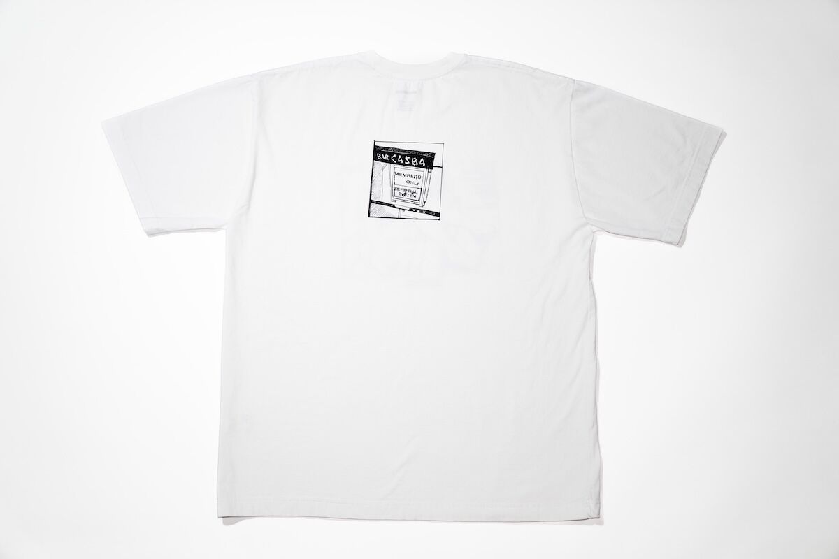 ネイバーフッドとの一枚は、カスバの夜を切り取ったようなワンシーンと、エントランスの階段に飾られた象徴的なコーナーをグラフィックで表現。デザイナー兼代表の滝沢伸介氏が自らドローイングを手がけており、会話の断片を思わせるテキストも相まって、どこかアメコミのようなキャッチーさを感じさせる仕上がりに。