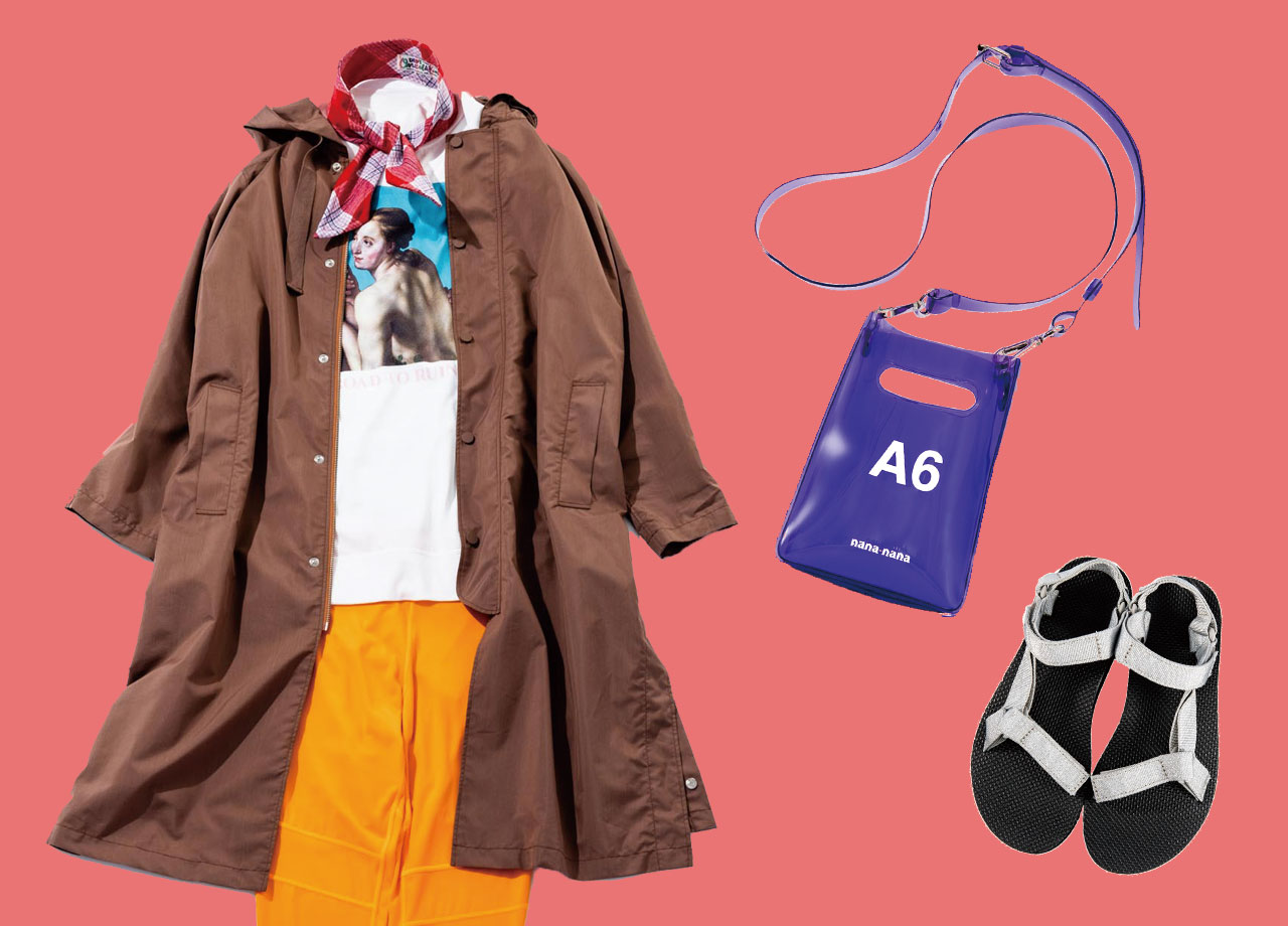 コート¥61,000/Wellder for RHC(RHC ロンハーマン 045-319-6700) Tシャツ¥7,800/Huf(ハフ ジャパン 0548-24-1250) レギンス¥9,000/Calvin Klein Performance(カルバン・クライン カスタマーサービス 0120-657-889) レッドのスカーフ¥4,500/Dept(デプト トーキョー 03-3780-4455︎) PVCバッグ¥6,000/Nana-nana︎(ミッド タウン プロジェクト 03-6455-4367︎) サンダル¥7,800/Teva®(デッカーズジャパン 0120-710-844)