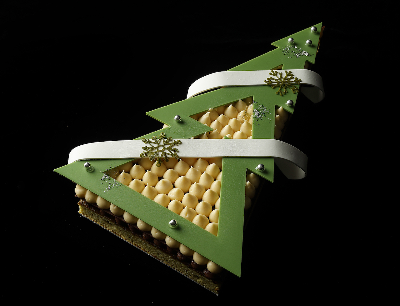 グリーンとイエローの色合いが鮮やかなクリスマスツリー型。ピスタチオをベースにした生地に、柑橘フルーツのカラマンシークリーム、さらに柚子風味のショコラを使用。酸味が利いた爽やかな味わいが、やみつきになること必至。