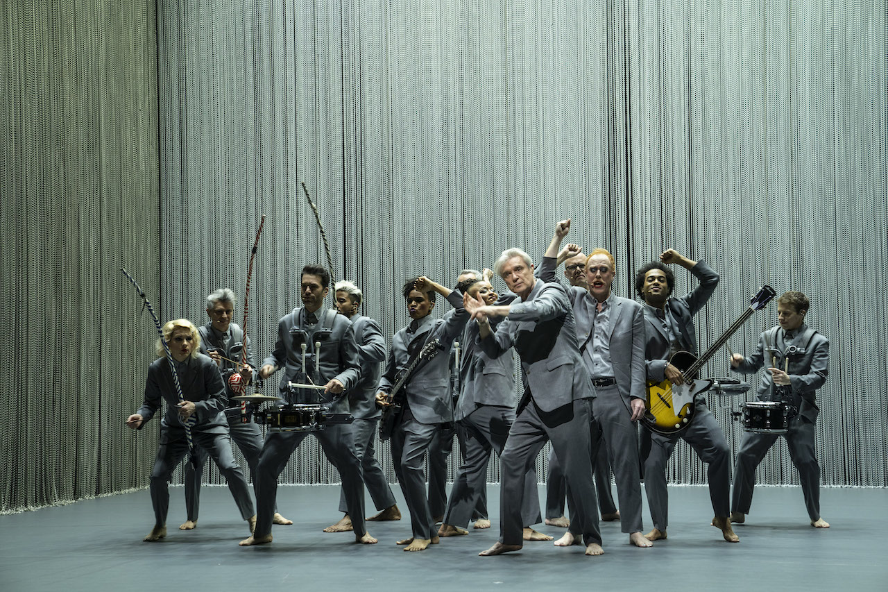 まさしく至福の107分! 映画が開幕すると67歳のデイヴィッド・バーンは、グレーのスーツに裸足というスタイルで、まずは独りで決して広くはないステージに現われる。
