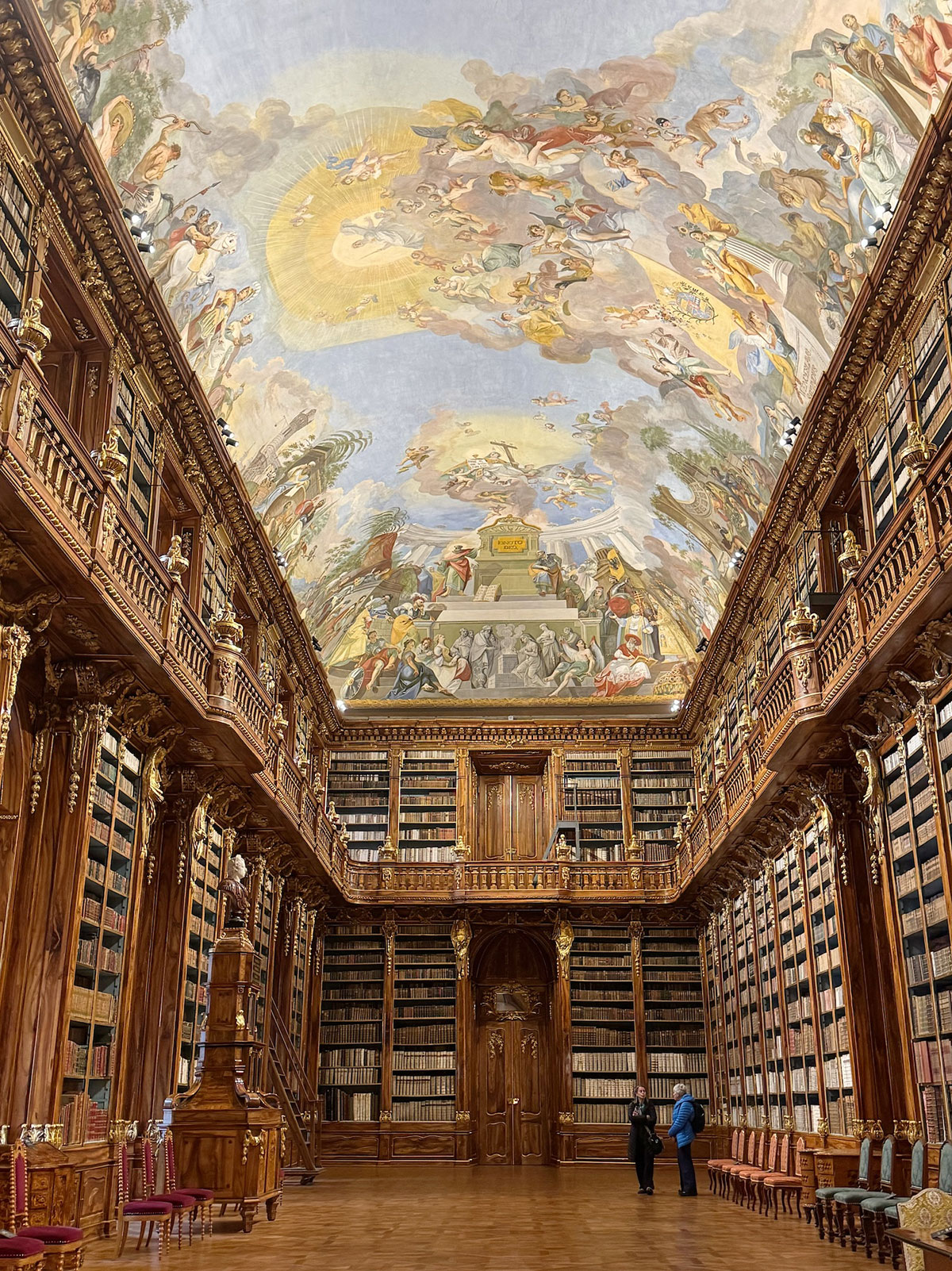 まず、高い天井とフレスコ画が美しい「哲学の間」。壁面の本棚にも圧倒されてしまいます。