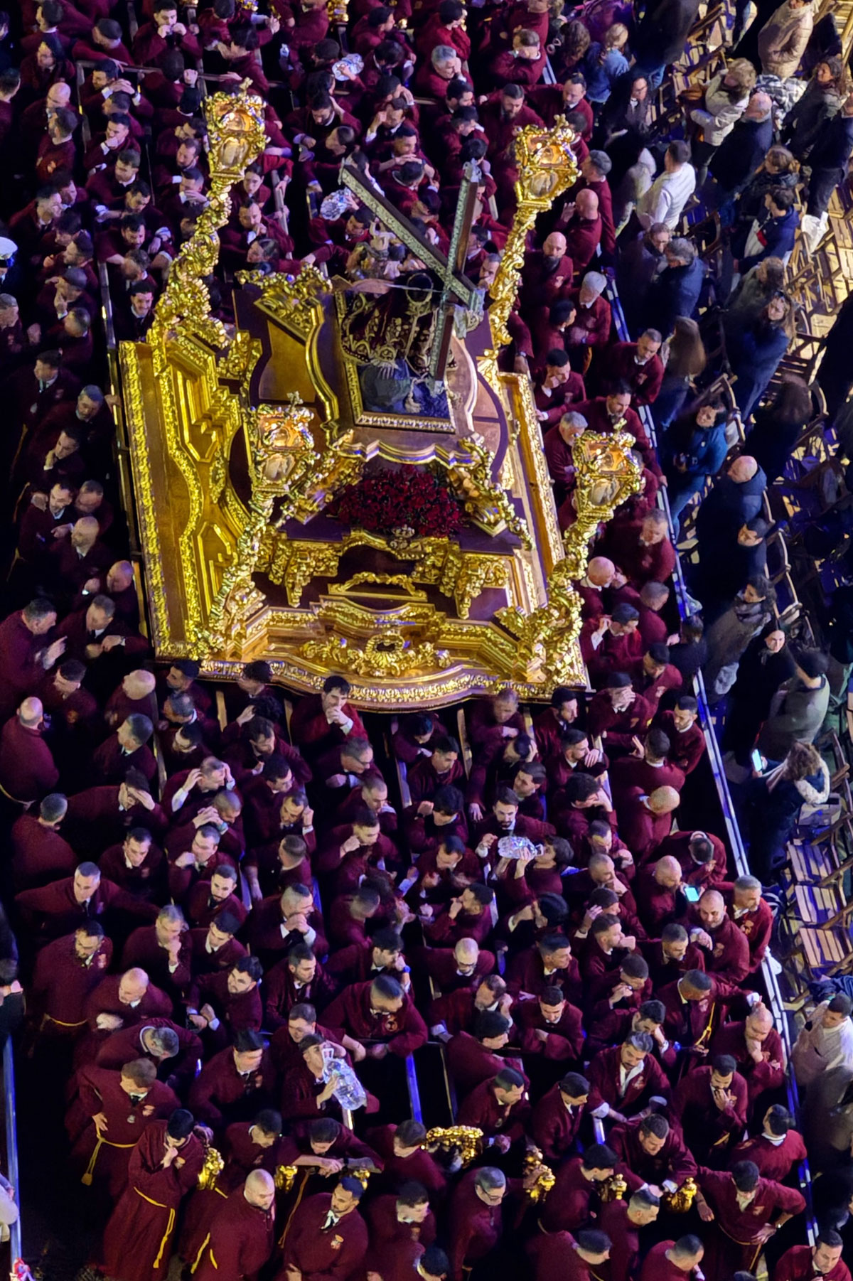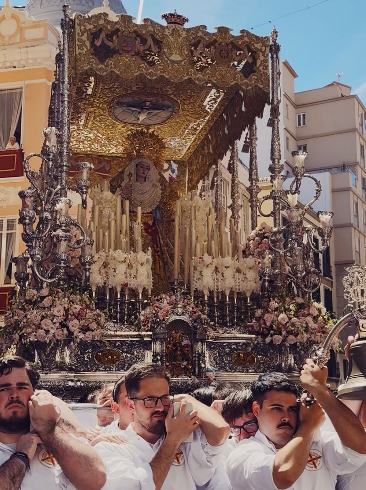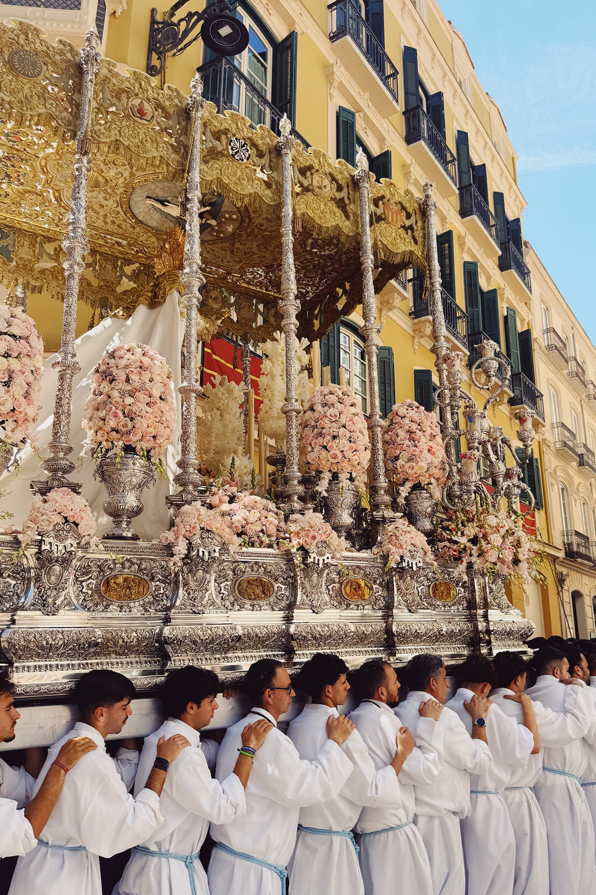 プロセッションと呼ばれる行列では、期間中、豪華に装飾された、いくつもの山車(トロノ)が人々によって担がれ、街中を回っていきます。パッと見、日本でいうお神輿に似ているなと。お神輿が威勢よく巡回していくのに対し、マラガのトロノはゆっく〜り街を歩いていきます。
