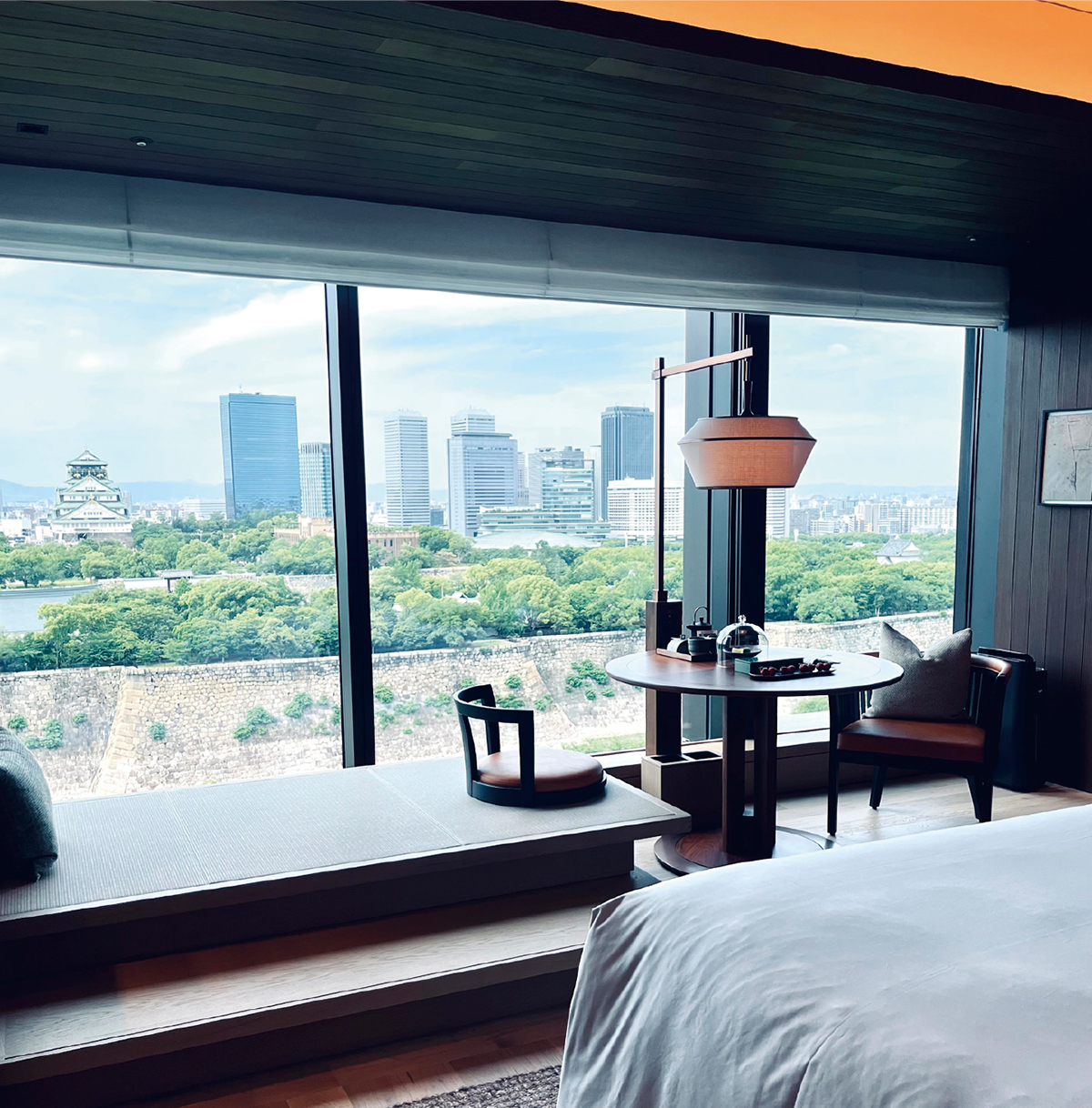 左:外光が差し込む20メートルの温水インドアプール。SUPヨガなど、プログラムも充実。 右:ジャポネスクモダンなインテリアのゆったりとした客室。畳のシーティングエリアもあり、くつろげます。ヨガマットが常備されているのもうれしい。私が宿泊した部屋は大阪城ビュー。緑に囲まれたお城が美しかった。桜の季節も素敵そうです。
