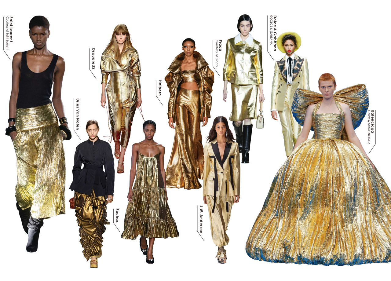 堂々たる存在感を放つパワーゴールドからは、十分に新年を闘い抜くエネルギーをいただけそう。1976年に発表したロシアンコレクションから着想したサンローラン(Saint Laurent)やクリスチャン・ラクロワ(Christian Lacroix)との共作が話題のドリス ヴァン ノッテン(Dries Van Noten)、バレンシアガ(Balenciaga)と、装飾主義の再燃で臆せずゴールドを身に纏う強い女性像がトレンドに浮上した。