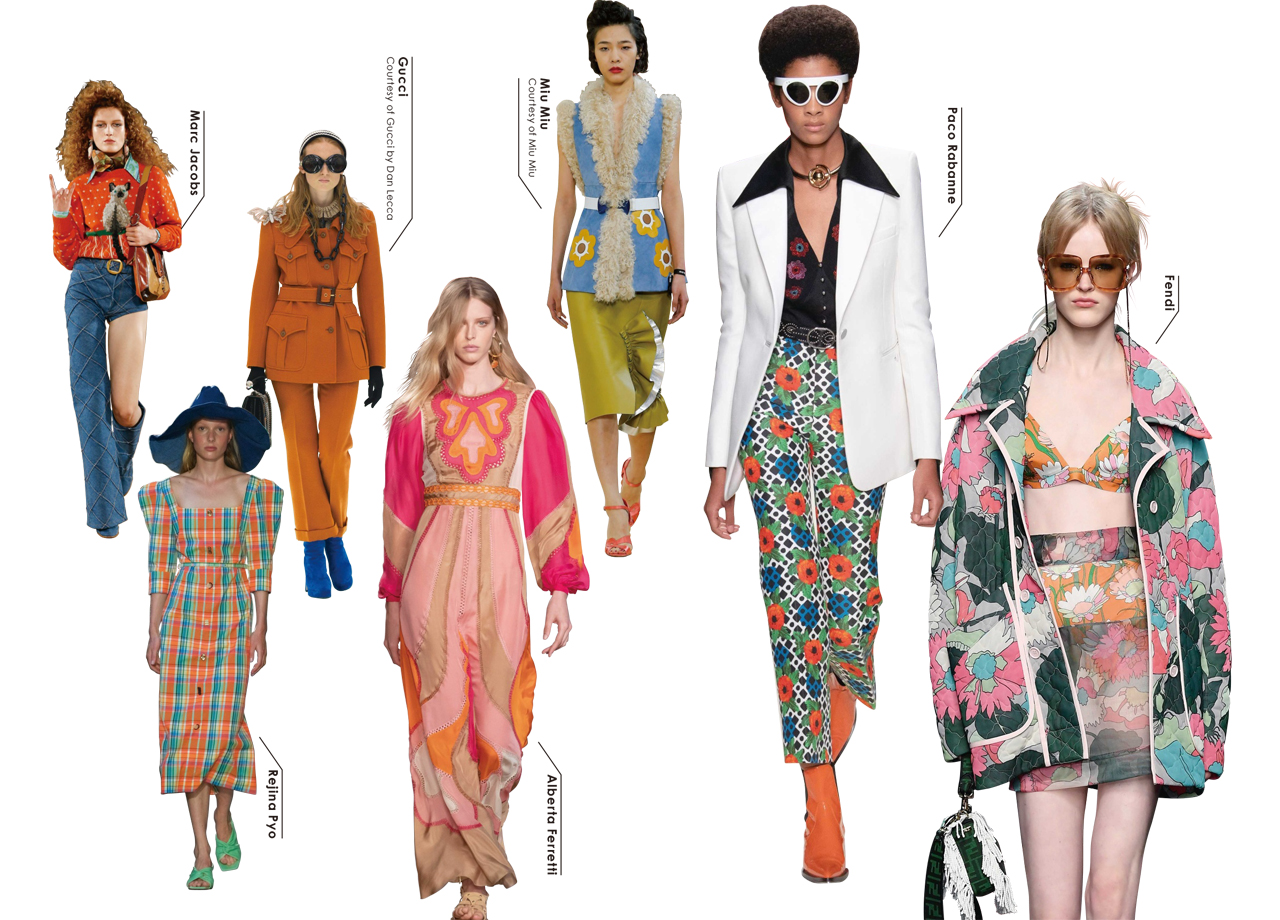 パコ ラバンヌ(Paco Rabanne)やフェンディ(Fendi)は、70年代のヴィンテージライクなムードを放つ刺繍やプリントを織り交ぜた。キッチュなイラストニットやレトロなフラワープリントなど当時のムーブメントを受け継いだ独特な懐かしさで新時代のレトロを表現。ユニークなデザインのアイウェアや存在感抜群のイヤリングと遊び心たっぷりのアクセサリーでモダンな表情に。