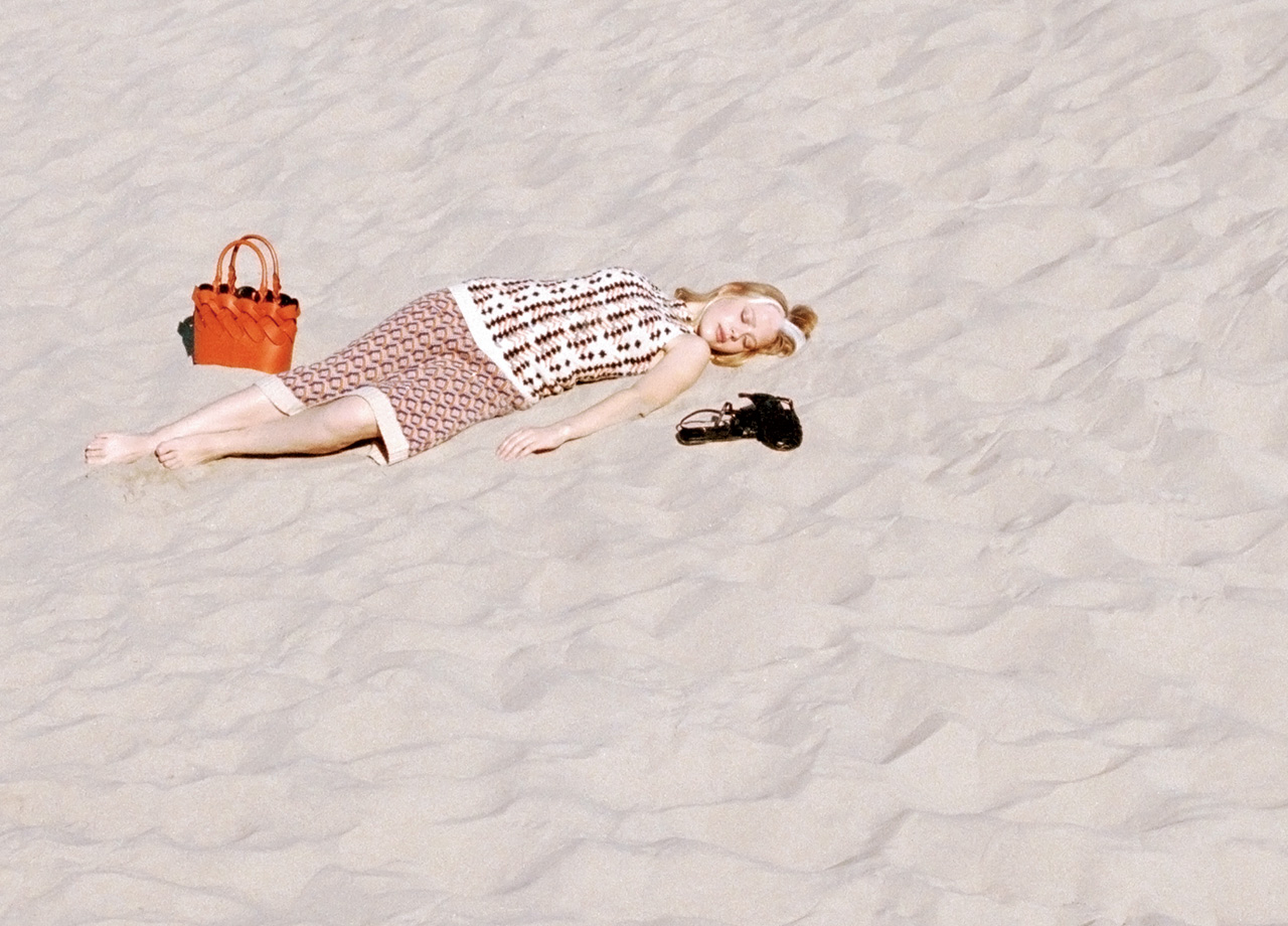 オレンジやピンク、ゴールドなどのカラーリングが、夏の日が差すヴェニスビーチによく映える。そんなエレガントでいてヘルシーな印象のプラダ(Prada)2020年春夏コレクションを纏ったのは、おでこの美しい白斑が特徴的なティア・ジョンソン(Tia Jonsson)。モデル出身で最近はフォトグラファーとしての活躍をみせるカルロッタ・コールによるサマーストーリーが紡ぎ出された。(『ヌメロ・トウキョウ(Numero TOKYO)』2020年6月号掲載)