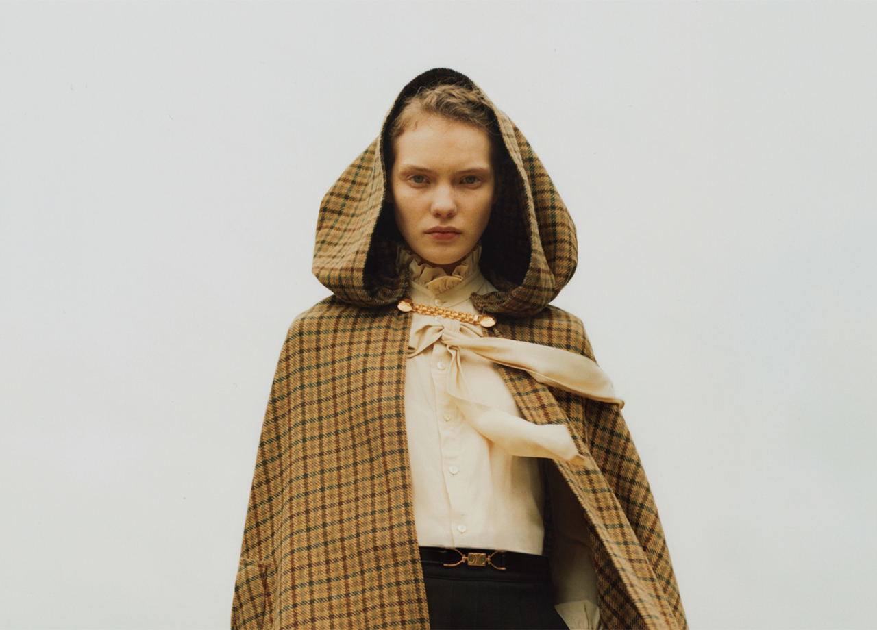 襟元のゴールドチェーンをさり気なく効かせた、チェックを可愛らしくもレディに纏える、セリーヌのケープ。フリルのボウタイブラウスに、プリーツスカートを合わせて、とことんクラシカルに。