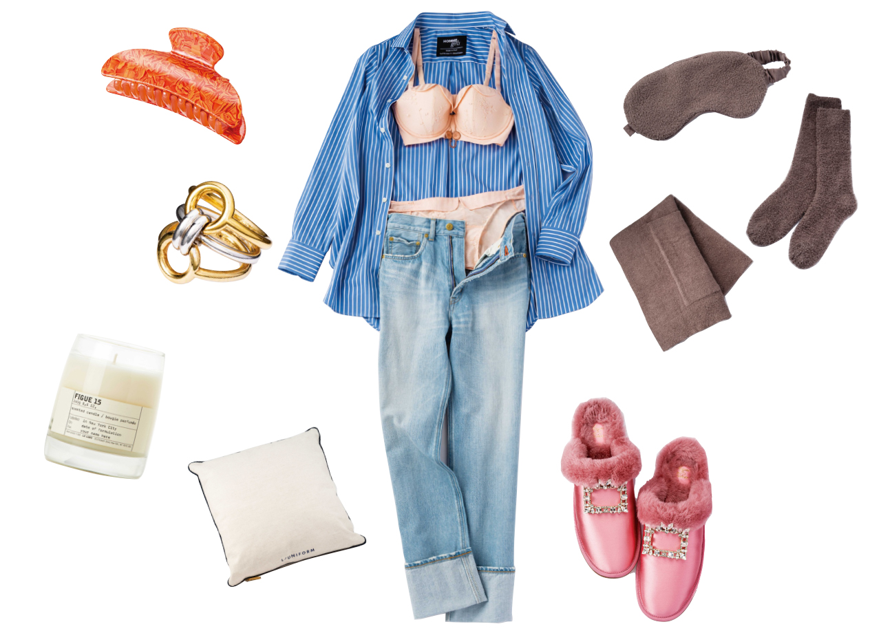 ブラ ¥27,000 ショーツ ¥14,000/ともにChantal Thomass(ガブリエルペコ 03-3498-7315) ストライプシャツ ¥29,000/Homme Girls(ロンハーマン 03-3402-6839) ワイドデニム ¥38,000/Tu Es Mon Tresor(エド ストローム オフィス 03-6427-5901)バレッタ ¥6,000/Machete(H3O ファッションビュロー 03-6712-6180) トラベルセット(収納ポーチ付き) ¥27,000/Barefoot Dreams(サザビーリーグ 03-5412-1937) 3連リング ¥75,000/Charlotte Chesnais(エドストローム オフィス 03-6427-5901) フィグ 15 クラシック キャンドル ¥10,000/Le Labo(ル ラボ お客様相談室 0570-003-770) クッションカバー ¥15,000/L/uniform(リュニフォーム トウキョウ 03-6812-2930)ファー付き シューズ ヒール0.5cm ¥186,000/Roger Vivier (ロジェ・ヴィヴィエ・ジャパン 0120-957-940)