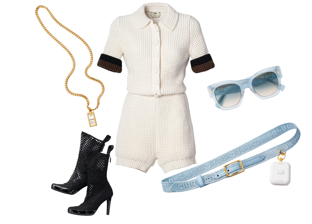 1. ベルトに付けたスマートウォッチケース(W4× H7×D1.5cm)¥46,200 ベルト¥68,200 2. サングラス ¥47,300 3. オールインワン¥126,500 4. 好きなワードを選べるダイスネックレス ¥143,000 5. メッシュブーツ ヒール 9.5cm ¥203,500/すべてFendi(フェンディ ジャパン 03-3514-6187)