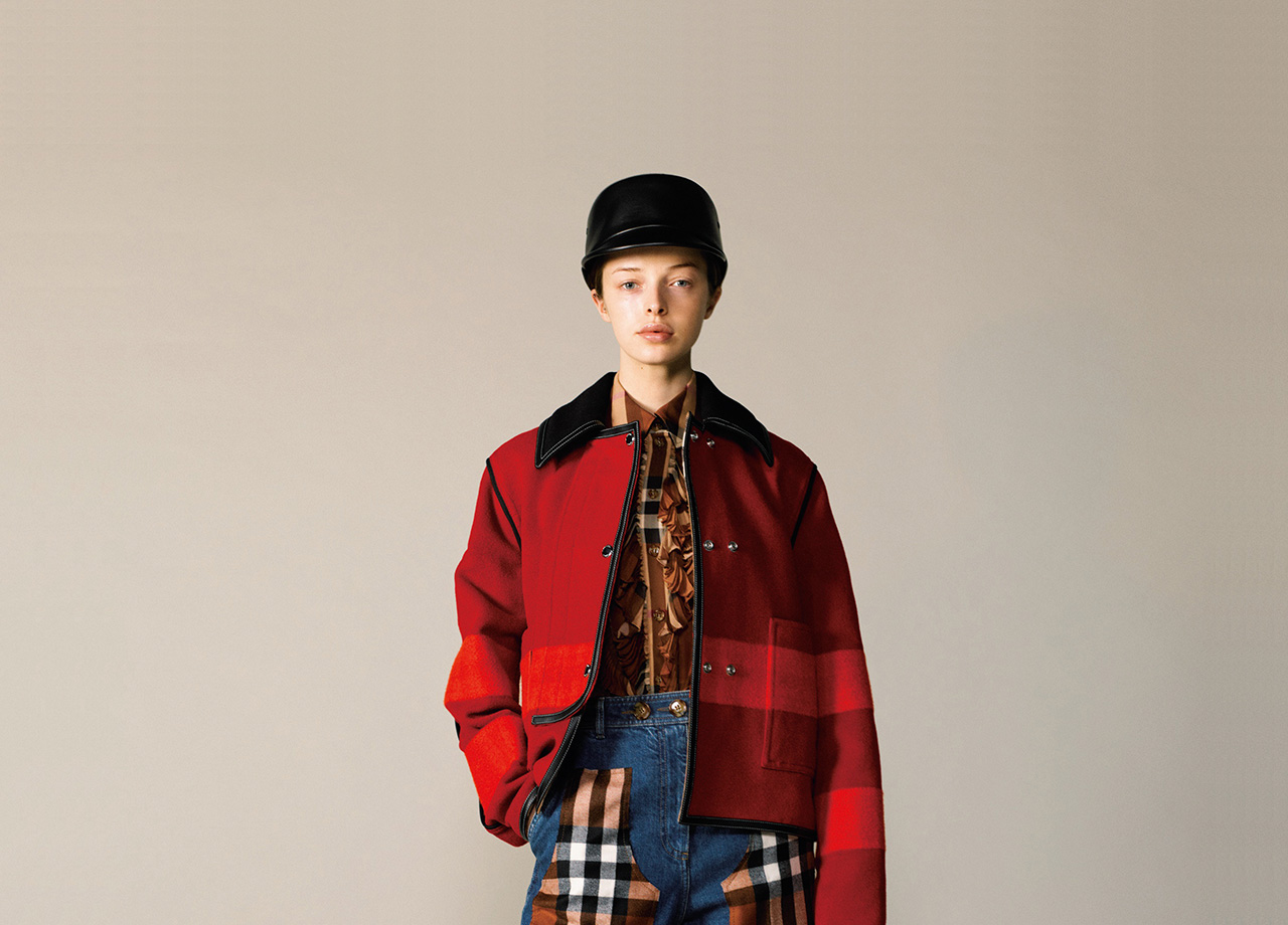 バーバリーだからこそ表現できる英国のアイデンティティが詰まったルック。シャツ、デニムパンツにバーバリーチェックを施し、ワードローブにブリティッシュエッセンスをプラスした。ツイストを存分に効かせたユース感溢れるスタイルを完成させて。