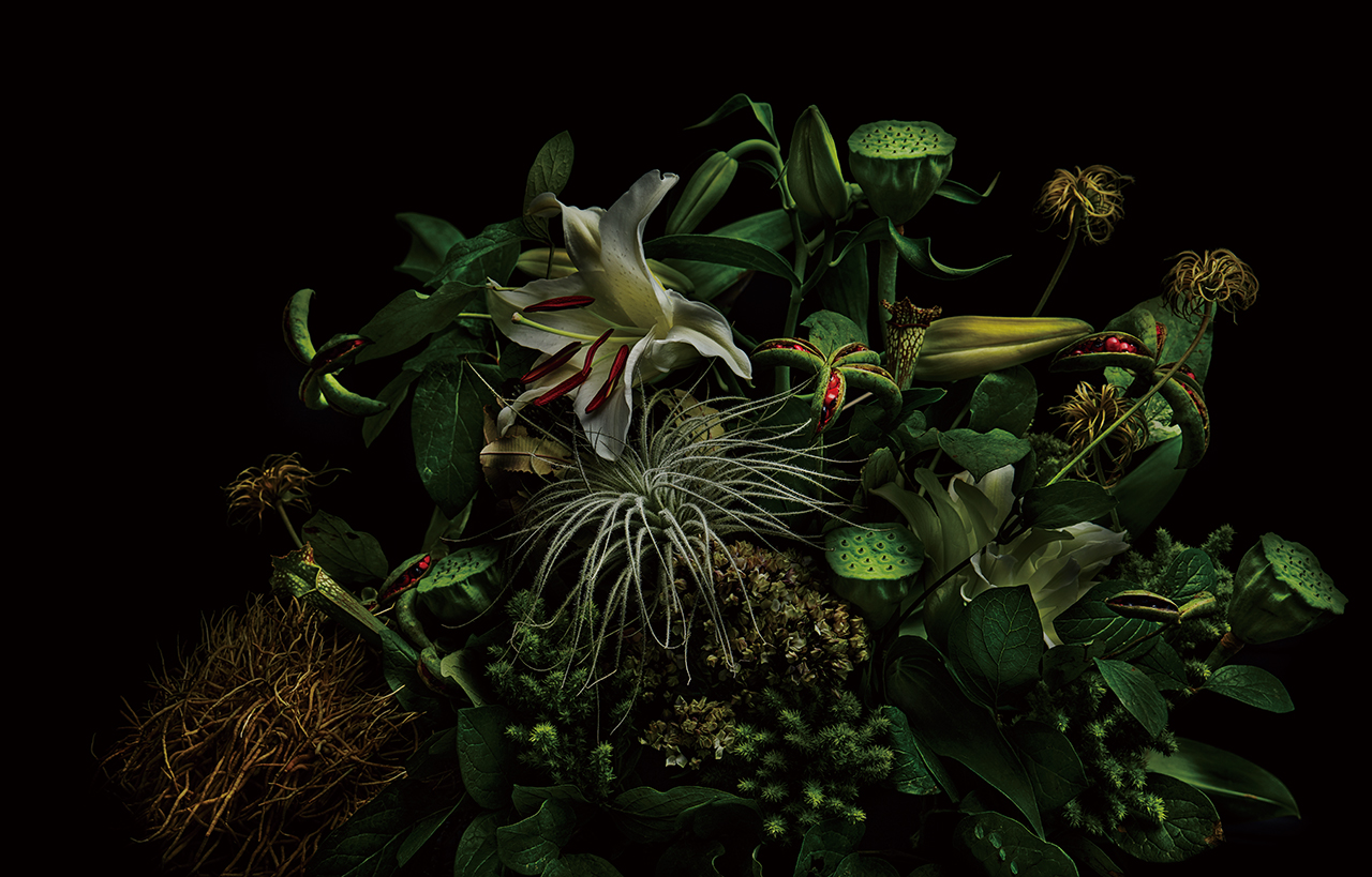 東信が手がける「Numero TOKYO(ヌメロ・トウキョウ)」本誌の連載企画「今月のフラワーアート」。強さやエネルギーを秘めた、花本来の本質的な美しさをアートで表現する。 Vol.191は、「深遠なる記憶の実り」。